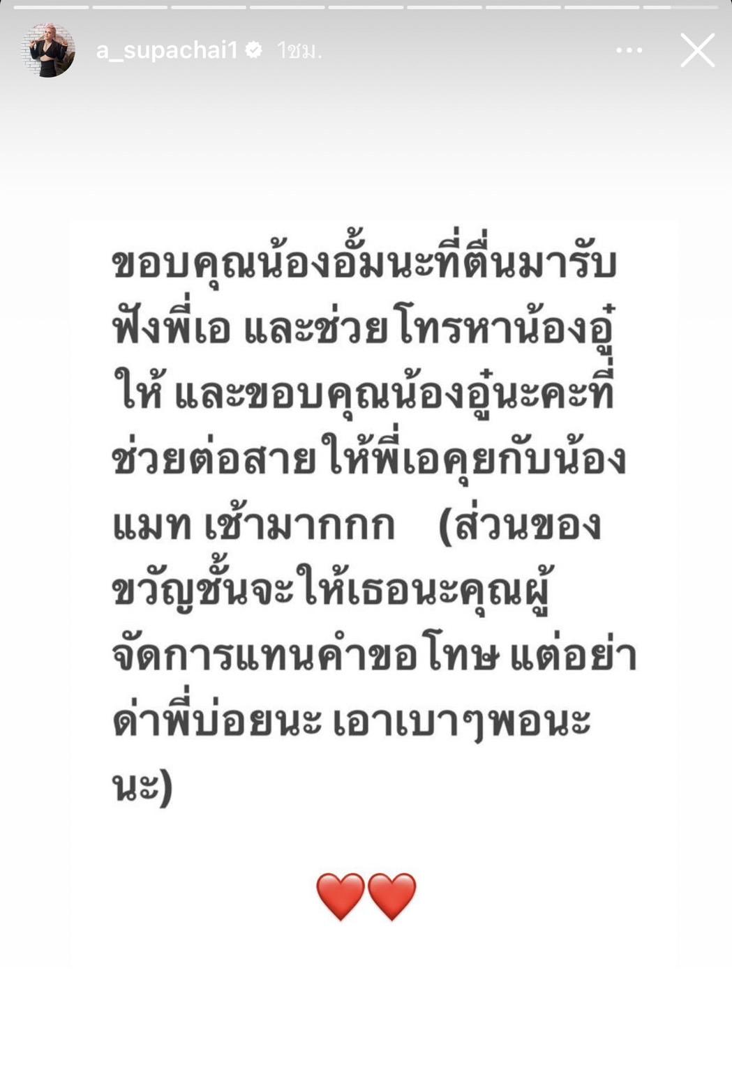ในขณะที่สาว แมท และทุกฝ่ายต่างก็ได้ออกมาเคลียร์ รวมถึง เอ ศุภชัย ที่ล่าสุดได้โพสต์ข้อความผ่านสตอรี่ไอจีส่วนตัวเพื่อชี้แจง และขอโทษ แมท และ อั้ม ที่ทำให้เป็นข่าวทั้งหมด จนคนทั้งประเทศเข้าใจผิด