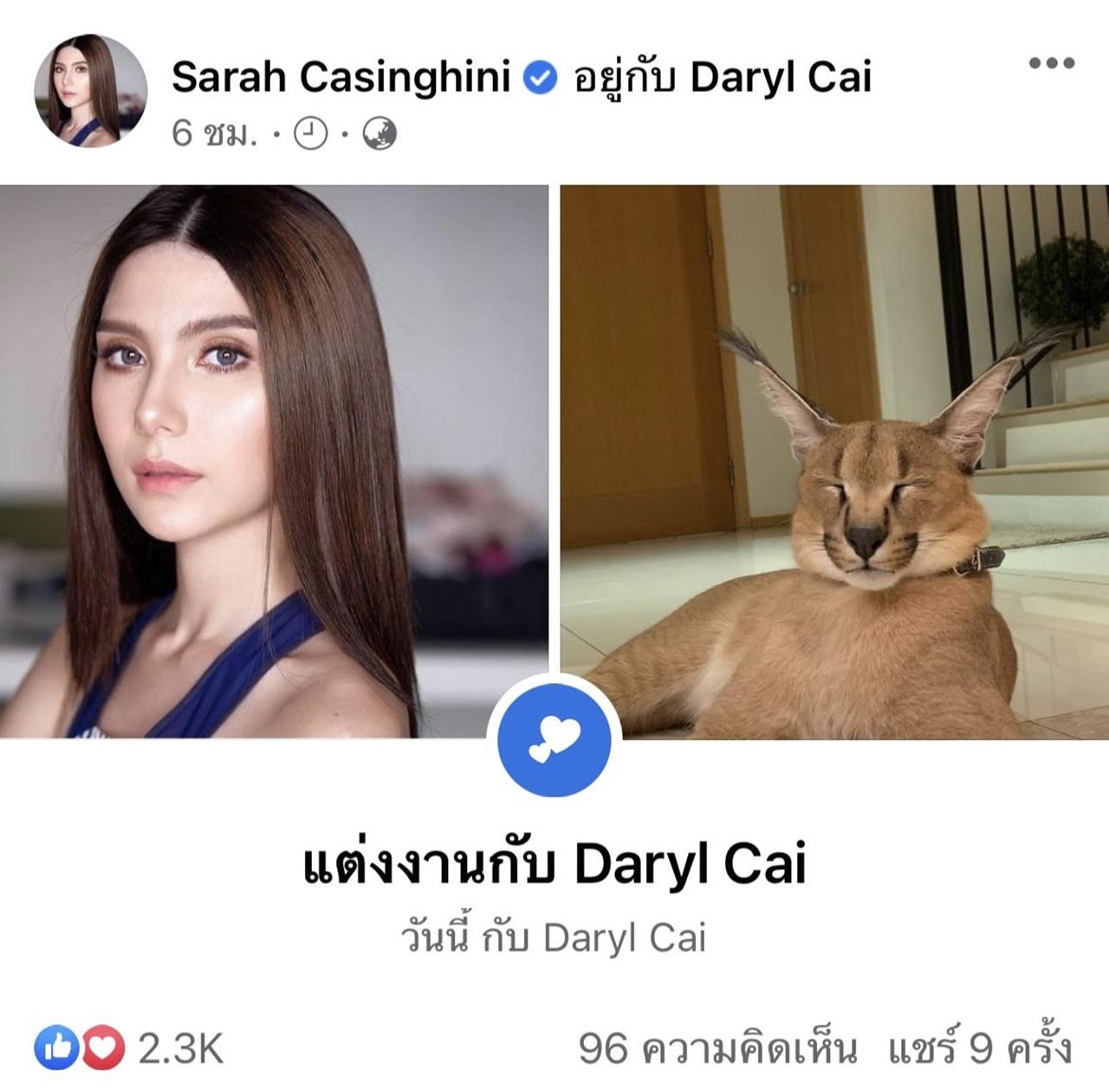 โดยสาวซาร่า ได้ขึ้นสถานะแต่งงานแล้วกับหนุ่มชาวสิงคโปร์ว่า "Married Daryl Cai Today with Daryl Cai" และหลังจากที่ ซาร่า ได้เผยสถานะของตัวเองว่าไม่โสดอีกต่อไป ก็มีเพื่อนๆ และแฟนๆ เข้ามาคอมเมนต์แสดงความยินดีกับคุณแม่ลูกสองอย่างมากมาย บันเทิงไทยรัฐออนไลน์ก็ขอแสดงความยินดีกับความรักครั้งใหม่ของซาร่าด้วยนะคะ
