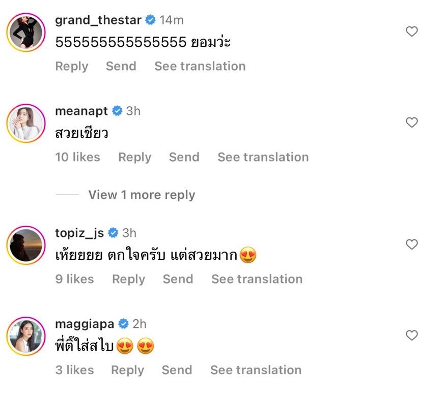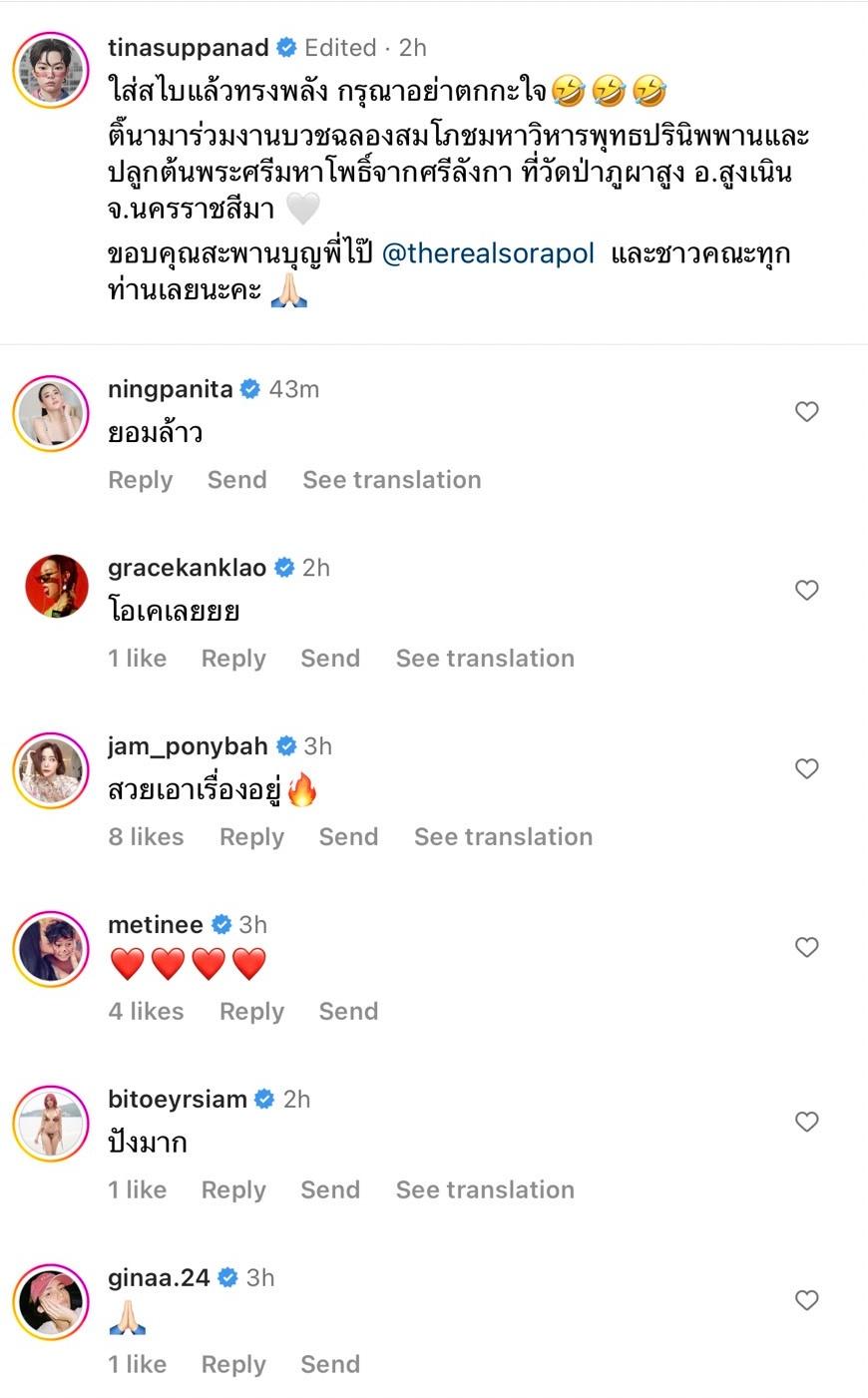 งานนี้ทำเอาเพื่อนพี่น้องในวงการบันเทิงคอมเมนต์รัวๆ อาทิ หนิง ปณิตา “ยอมล้าว”, เกรซ กาญจน์เกล้า “โอเคเลยยย”, แจม วรัฐฐา “สวยเอาเรื่องอยู่”, ใบเตย อาร์สยาม “ปังมาก”, ท็อป จรณ “เห้ยยยย ตกใจครับ แต่สวยมาก”, แม็กกี้ อาภา “พี่ติ๊ใส่สไบ” ฯลฯ รวมไปถึงชาวเน็ตที่นอกจากจะอนุโมทนาสาธุบุญแล้ว ต่างก็บอกว่าลุคนี้สวยหวานมากจริงๆ.