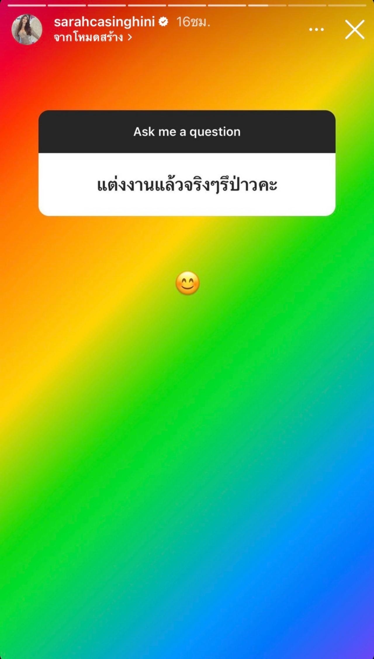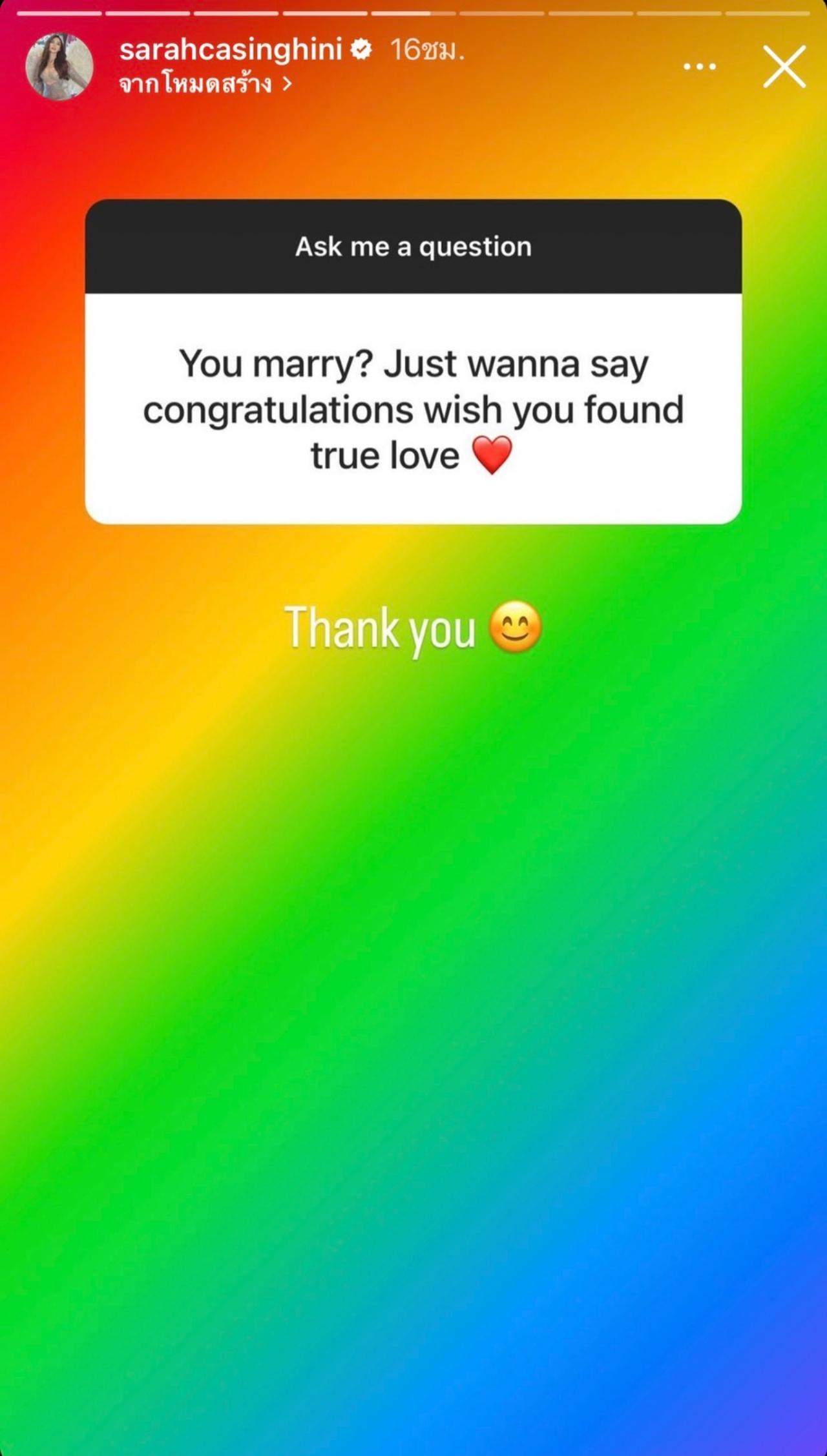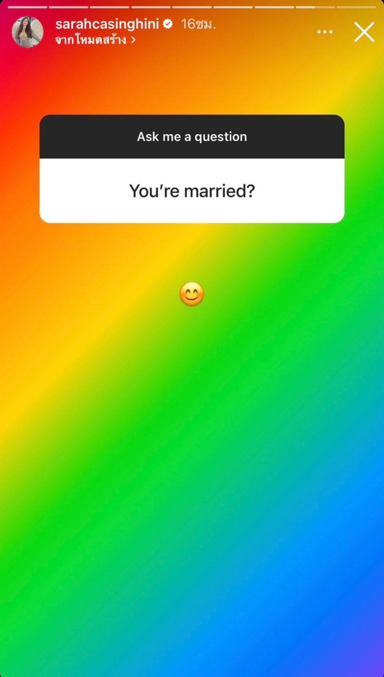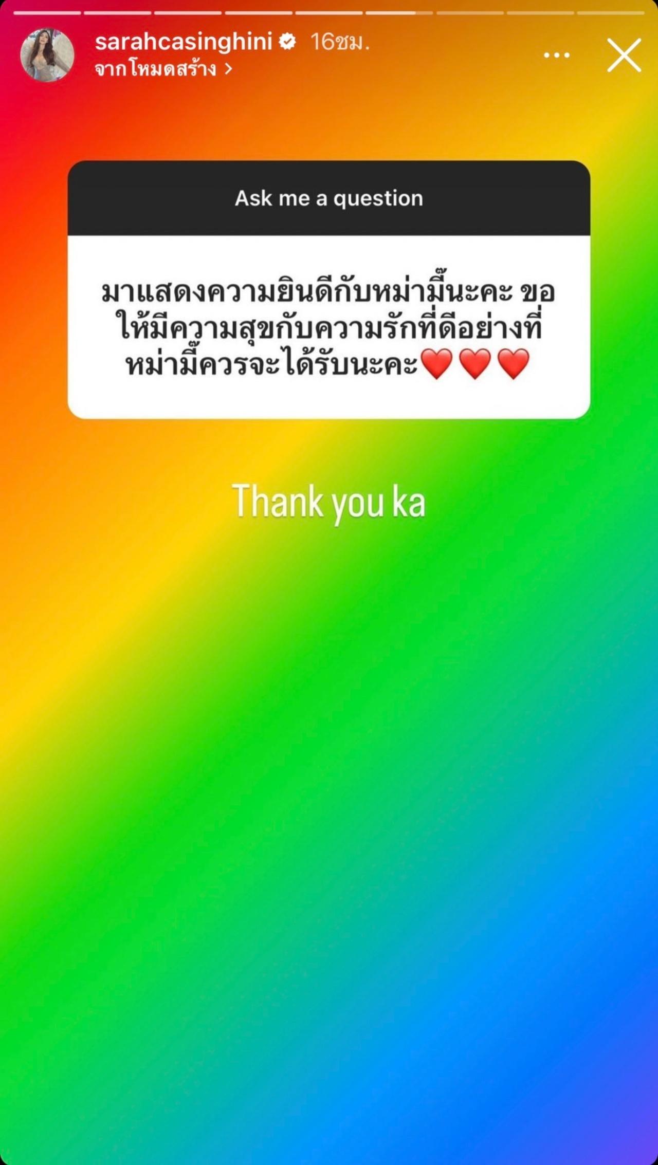 นอกจากนี้ ซาร่า คาซิงกินี ยังได้เข้าไปขอบคุณ คนที่เข้ามาแสดงความยินดีกับความรักครั้งใหม่ของเธอ รวมทั้งตอบกลับคำถามที่แฟนๆ ถามว่าตอนนี้แต่งงานแล้วหรือไม่ ด้วยอีโมจิรูปหน้ายิ้ม ส่วนจะแต่งจริงหรือไม่นั้นคงรอฟังจากปากของเจ้าตัวน่าจะชัวร์ที่สุด