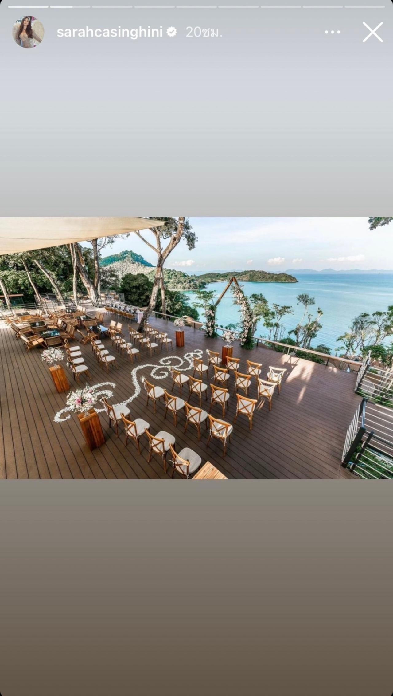 แต่ล่าสุด อินสตาแกรมของ ซาร่า ก็ได้อัปไอจีสตอรี่เป็นคลิปพาชมสถานที่แห่งหนึ่ง ซึ่งวิวสวยและมองเห็นทะเลโดยในคลิปมีเสียงพูดว่า “มาดูสถานที่นะคะ” ก่อนจะตามมาด้วยภาพบรรยากาศคล้ายจัดเตรียมงานแต่งงาน