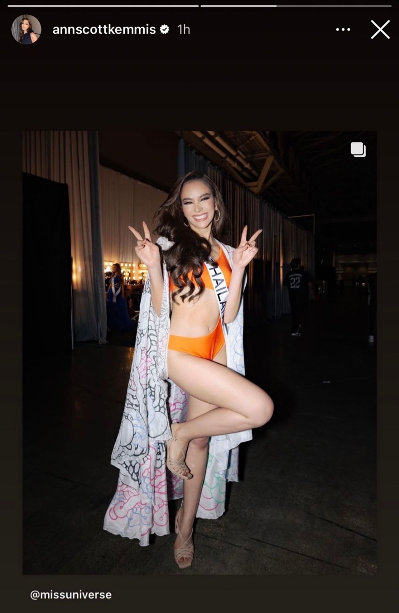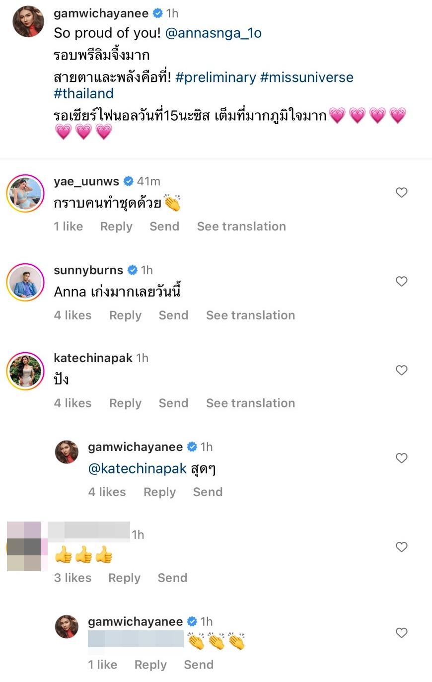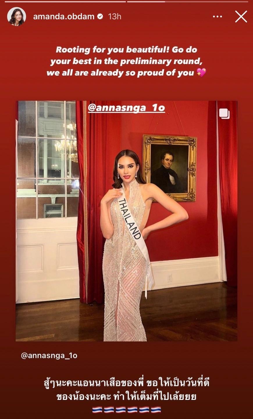 รวมไปถึง อแมนด้า ออบดัม มิสยูนิเวิร์สไทยแลนด์ 2020 ที่โพสต์ภาพในไอจีสตอรี่ และให้กำลังใจว่า “Rooting For you beautiful! Go do your best in the preliminary round, we all are already so proud of you สู้ๆ นะคะแอนนาเสือของพี่ ขอให้เป็นวันที่ดีของน้องนะคะ ทำให้เต็มที่ไปเล้ยยย” พร้อมทั้งใส่อีโมจิหัวใจและธงชาติไทย