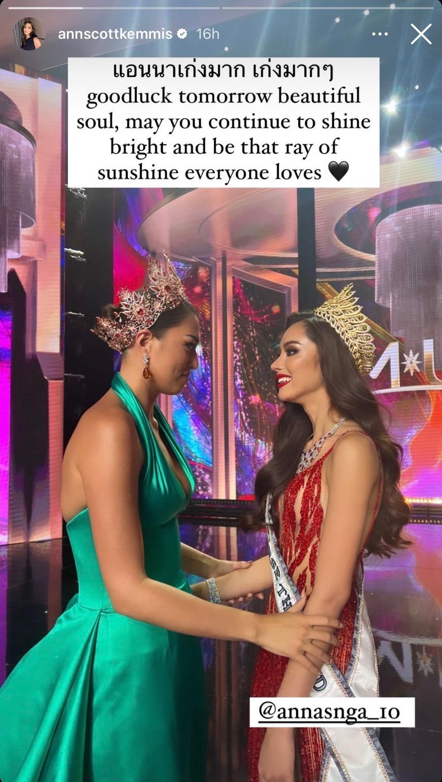 ด้าน แอนชิลี สก๊อต-เคมมิส มิสยูนิเวิร์สไทยแลนด์ 2021 ก็โพสต์ภาพคู่กับแอนนาเสือ และเขียนข้อความ “แอนนาเก่งมาก เก่งมากๆ Goodluck tomorrow beautiful soul, may you continue to shine bright and be that ray of sunshine everyone loves” อีกทั้งยังแชร์ภาพแอนนาเสือในรอบชุดว่ายน้ำด้วย.