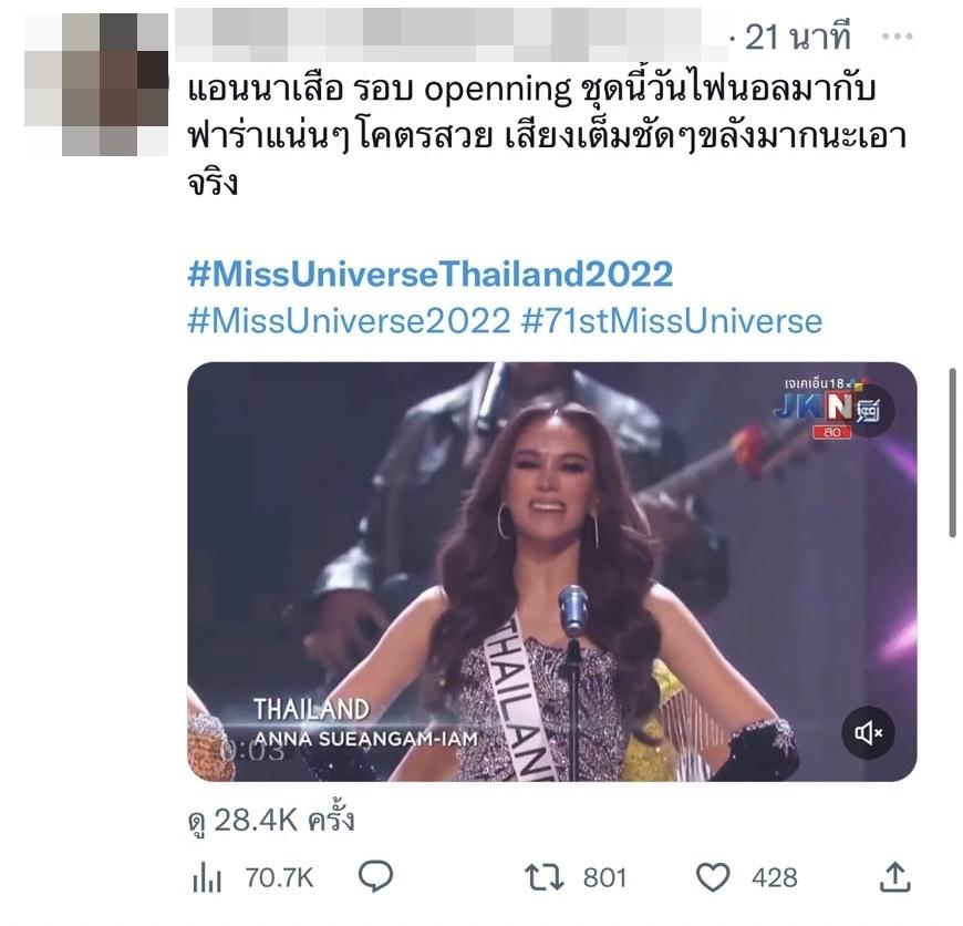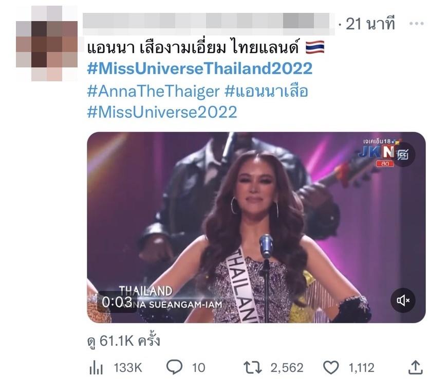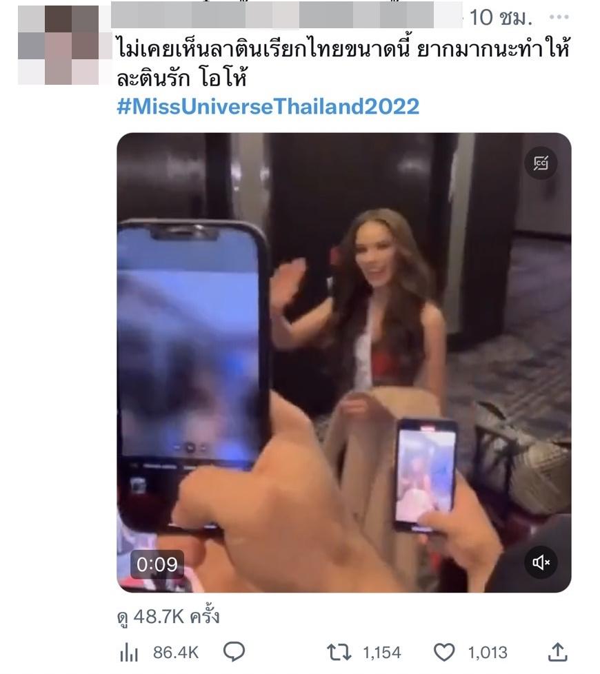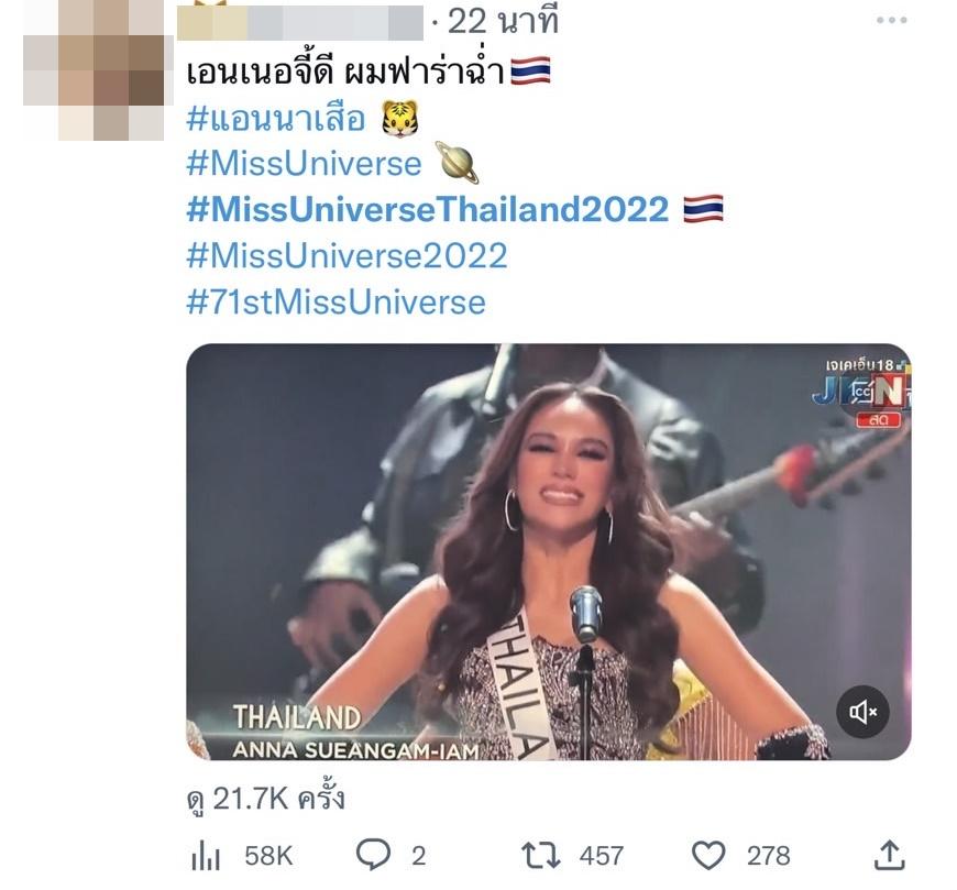 พร้อมทั้งโพสต์ภาพของ แอนนา เสืองามเอี่ยม Miss Universe Thailand 2022 สาวงามจากประเทศไทยที่เป็นตัวแทนประกวดครั้งนี้ และเขียนข้อความให้กำลังใจเป็นจำนวนมาก อาทิ เอนเนอจี้ดี ผมฟาร่าฉ่ำ, ตัวแม่ จะแคร์เพื่อ, ไม่เคยเห็นลาตินเรียกไทยขนาดนี้ ยากมากนะทำให้ละตินรัก โอ้โห ฯลฯ