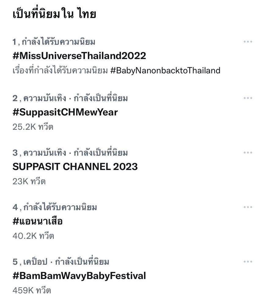 และในช่วงเช้าวันที่ 15 ม.ค. 2566 เวลา 08.00 น. ตามเวลาในประเทศไทย ได้มีการจัดประกวด Miss Universe 2022 รอบตัดสิน งานนี้นอกจากจะมีแฟนนางงามตามเชียร์กันเป็นจำนวนมากแล้ว ในโลกโซเชียลก็ได้ติดแฮชแท็ก #MissUniverseThailand2022 จนติดเทรนด์ทวิตเตอร์อันดับ 1 ในเวลานี้