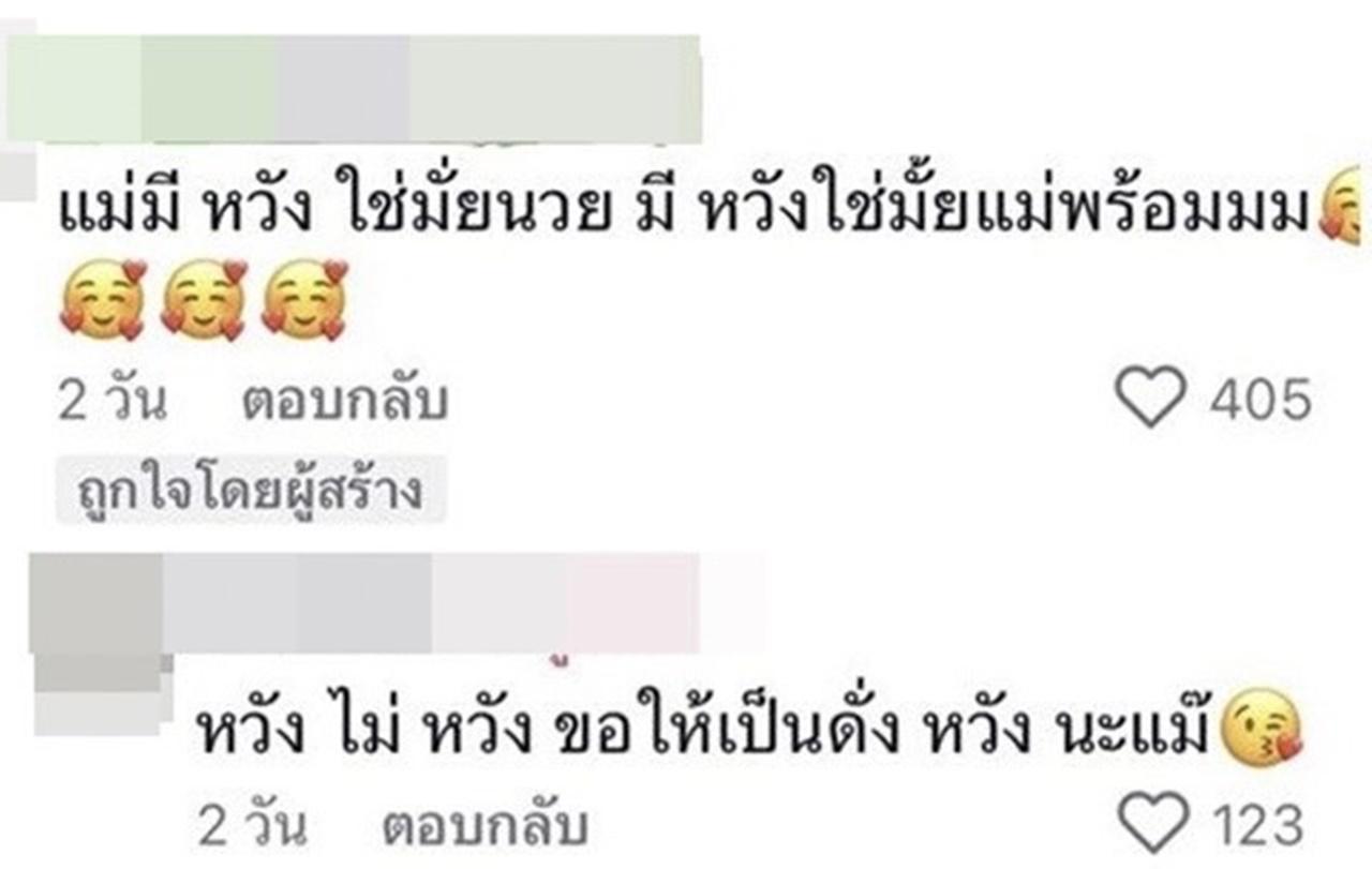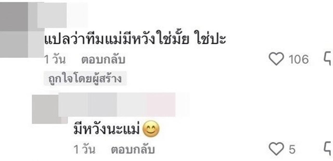 "แม่มี หวัง ใช่มั้ยนวยมีหวังใช่มั้ย แม่พร้อม, หวัง ไม่ หวัง ขอให้เป็นดั่ง หวัง นะแม๊, แต่ฉันหวังให้เธอได้สิ่งที่คาดหวัง, สมหวังนะครับ, แปลว่าทีมแม่มีหวังใช่มั้ย ใช่ปะ, มีหวังนะแม่"