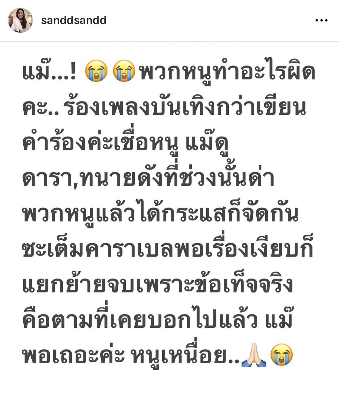 พอเรื่องเงียบก็แยกย้ายจบเพราะข้อเท็จจริงคือตามที่เคยบอกไปแล้ว แม๊พอเถอะค่ะ หนูเหนื่อย" พร้อมกับเขียนแคปชั่นใต้โพสต์ดังกล่าวเพิ่มอีกว่า "เห้ออออ.... #เหนื่อย #ข้อหาได้มาฟรีแต่อยู่ดีๆทำไมต้องจ่าย.. #แม๊ก็คือแม๊...."