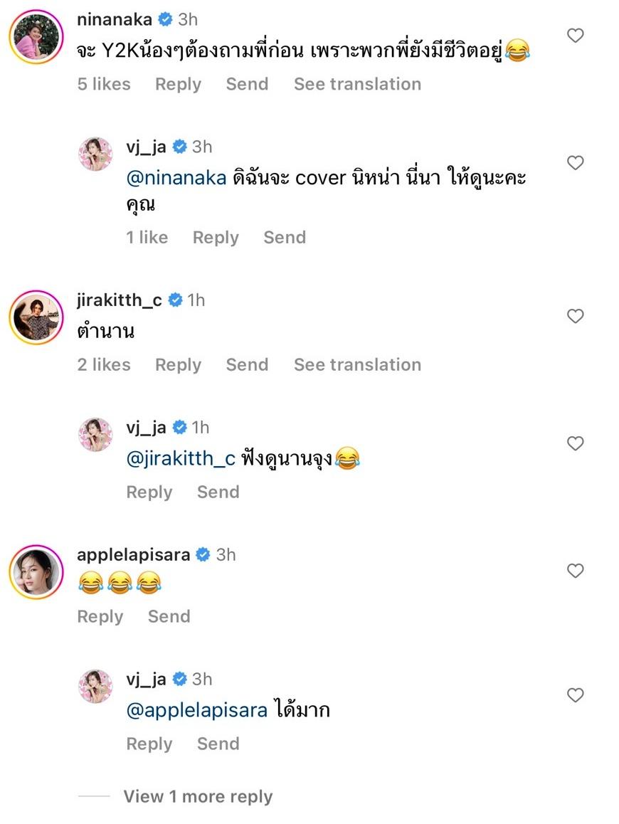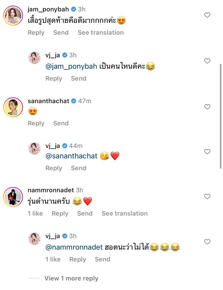 งานนี้นอกจากจะมีแฟนๆ รวมถึงคนในวงการบันเทิงเข้ามาคอมเมนต์แซวรัวๆ แล้ว คนในรูปอย่างวีเจวุ้นเส้นถึงกับคอมเมนต์หลังเห็นภาพตัวเองสมัยก่อนไว้ว่า “เพื่อน รูปเราเผาทิ้งไปเถอะ” ซึ่งวีเจจ๋าก็ตอบกลับว่า “ออกจะน่ารัก สาวฮอต”.