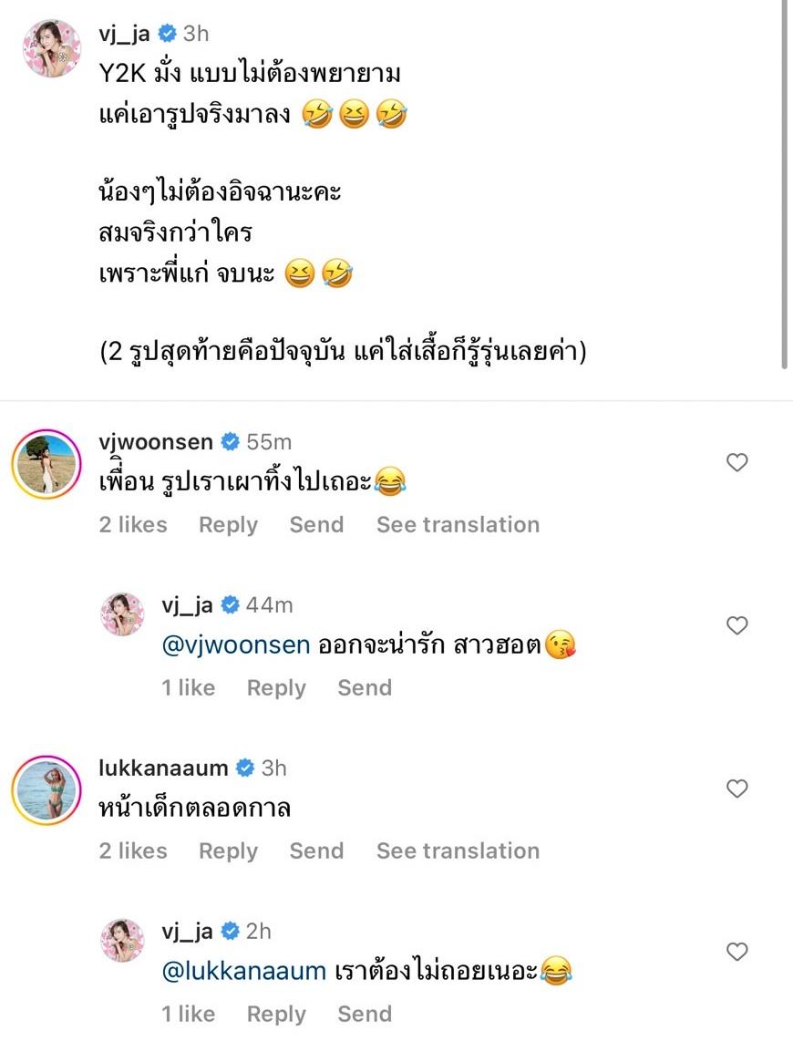 พร้อมทั้งเขียนแคปชั่นว่า “Y2K มั่ง แบบไม่ต้องพยายาม แค่เอารูปจริงมาลง น้องๆ ไม่ต้องอิจฉานะคะ สมจริงกว่าใคร เพราะพี่แก่ จบนะ (2 รูปสุดท้ายคือปัจจุบัน แค่ใส่เสื้อก็รู้รุ่นเลยค่า)”