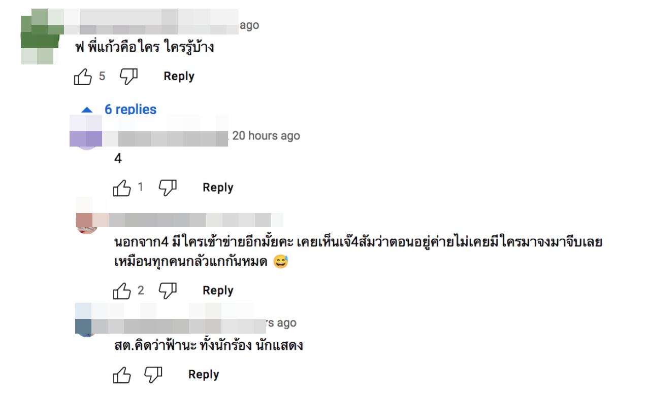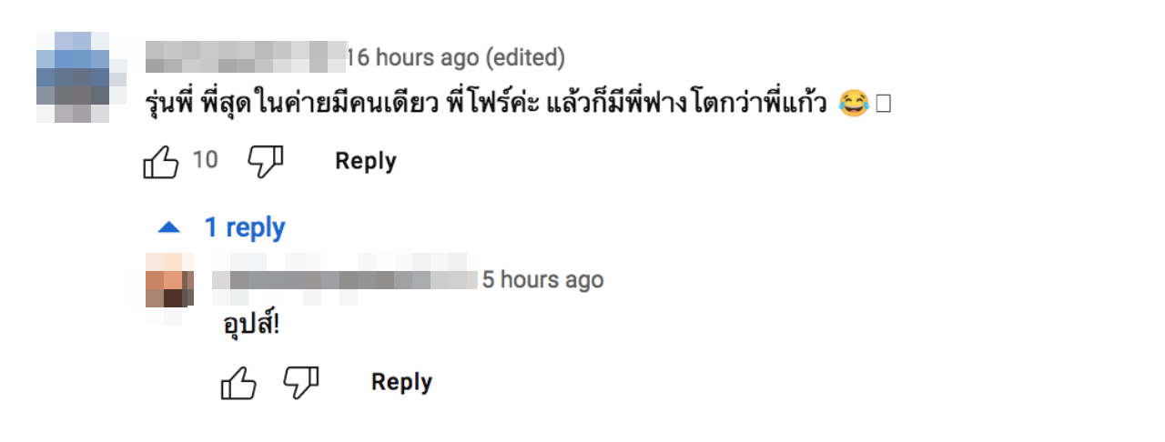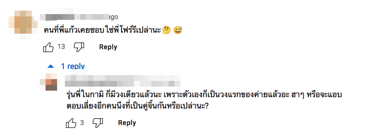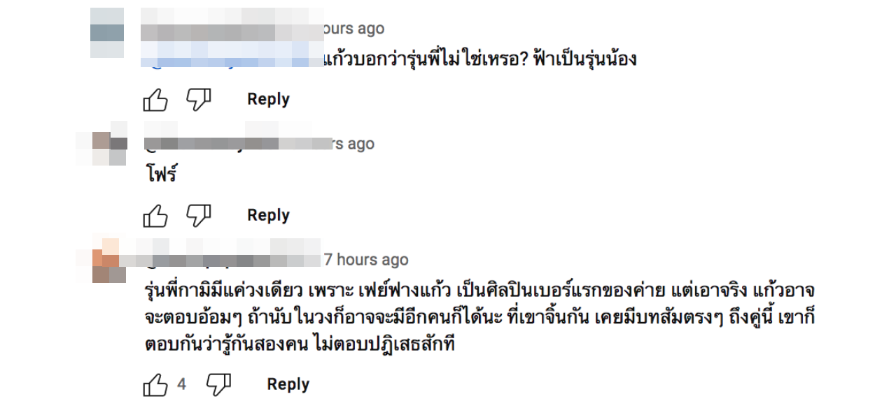 "ที่แก้วเคยแผ่มวล คือพี่โฟร์ใช่ม้ายยย, คนที่พี่แก้วเคยชอบใช่พี่โฟร์รึเปล่านะ, รุ่นพี่ในกามิ ก็มีวงเดียวแล้วนะ เพราะตัวเองก็เป็นวงแรกของค่ายแล้วอะ ฮาๆ หรือจะแอบตอบเลี่ยงอีกคนนึงที่เป็นคู่จิ้นกันหรือเปล่านะ?, รุ่นพี่ พี่สุดในค่ายมีคนเดียว พี่โฟร์ค่ะ แล้วก็มีพี่ฟางโตกว่าพี่แก้ว, คนที่อายุมากกว่า ตัวย่อ ฟ ผญ มีแค่ 2 คน คือ พี่โฟร์กับพี่ฟางนะ โดยส่วนตัวคิดว่าน่าจะพี่ฟางมากกว่า เพราะคู่นี้สนิทกันมากๆ เทคแคร์กันดีมาก (แอบรู้สึกว่าคุณฟางดูเกร็งตอนแก้วตอบเหมือนกัน แต่ทำตีเนียนมากกว่า รึเปล่า)".