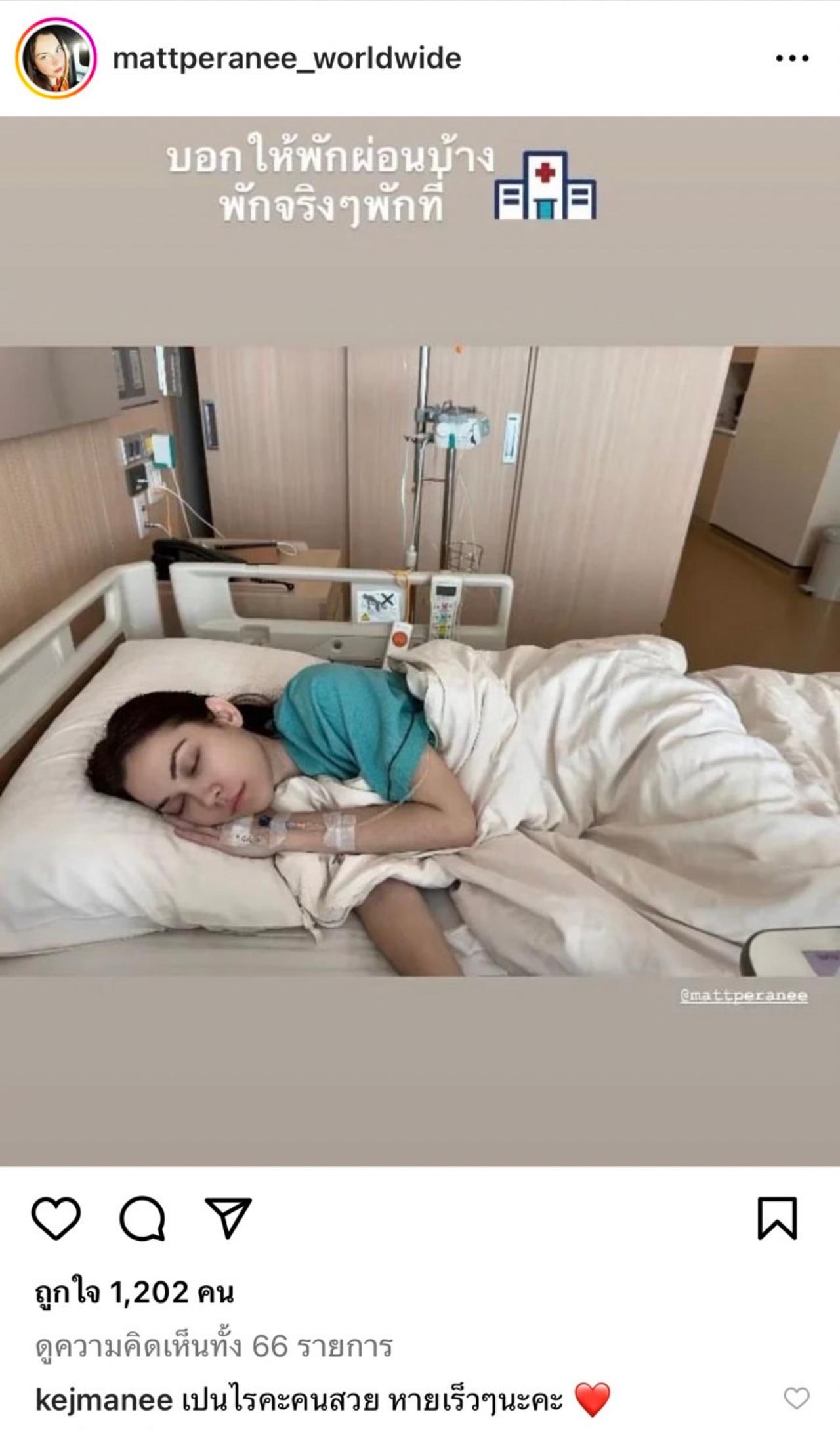 เพิ่งจะลงภาพผ่านอินสตาแกรมไปหมาดๆ หลังจากที่เพิ่งเปิดร้านไอติมเจลาโต้ปั่นสด สำหรับดาราสาว แมท ภีรนีย์ แต่ล่าสุดในอินสตาแกรมของแฟนคลับ mattperanee_worldwide แชร์ภาพนางเอกสาว แมท ภีรนีย์ เข้าแอดมิตในโรงพยาบาลนอนรักษาตัว พร้อมข้อความในภาพที่แชร์มาว่า "บอกให้พักผ่อนบ้าง พักจริงๆ พักที่ (รูปสัญลักษณ์โรงพยาบาล)"