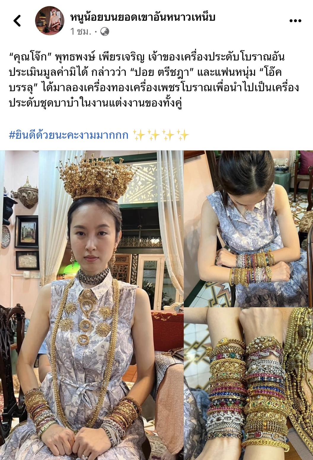 หลังจากนั้นทางเพจเฟซบุ๊ก หนูน้อยบนยอดเขาอันหนาวเหน็บ ได้อัปเดตเพิ่มเติมว่า "คุณโจ๊ก พุทธพงษ์ เพียรเจริญ เจ้าของเครื่องประดับโบราณอันประเมินมูลค่ามิได้ กล่าวว่า "ปอย ตรีชฎา" และแฟนหนุ่ม "โอ๊ค บรรลุ" ได้มาลองเครื่องทองเครื่องเพชรโบราณ เพื่อนำไปเป็นเครื่องประดับชุดบาบ๋าในงานแต่งงานของทั้งคู่"