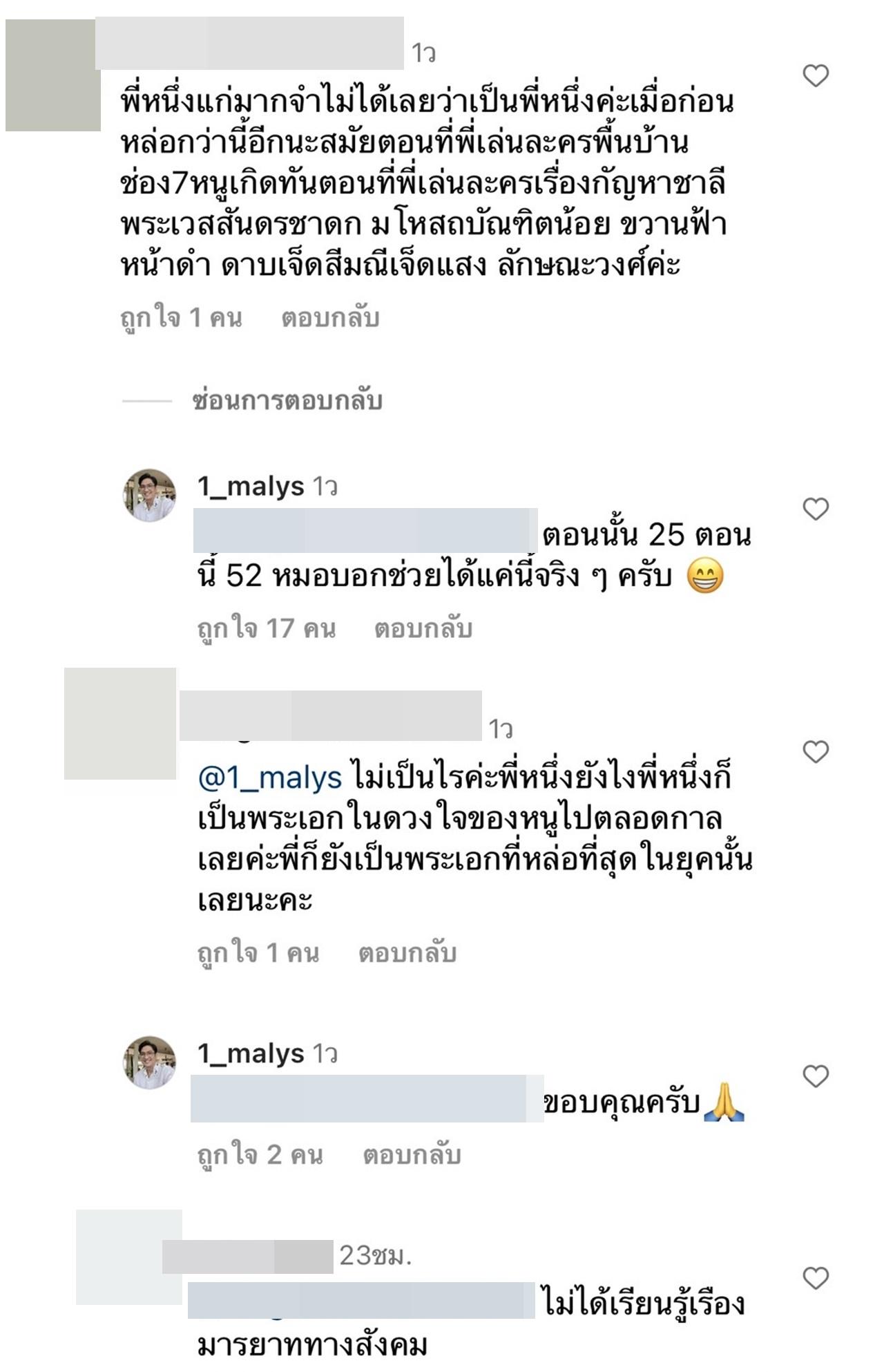 ซึ่งเจ้าตัวก็ได้ไปตอบกลับชาวเน็ตคนดังกล่าวว่า "ตอนนั้น 25 ตอนนี้ 52 หมอบอกช่วยได้แค่นี้จริงๆ ครับ" พร้อมกับอีโมจิรูปยิ้มกว้าง ก่อนที่เจ้าของคอมเมนต์ดังกล่าวจะเข้ามาตอบว่า "ไม่เป็นไรค่ะพี่หนึ่ง ยังไงพี่หนึ่งก็เป็นพระเอกในดวงใจของหนูตลอดกาลเลยค่ะ พี่ก็ยังเป็นพระเอกที่หล่อที่สุดในยุคนั้นเลยนะคะ"