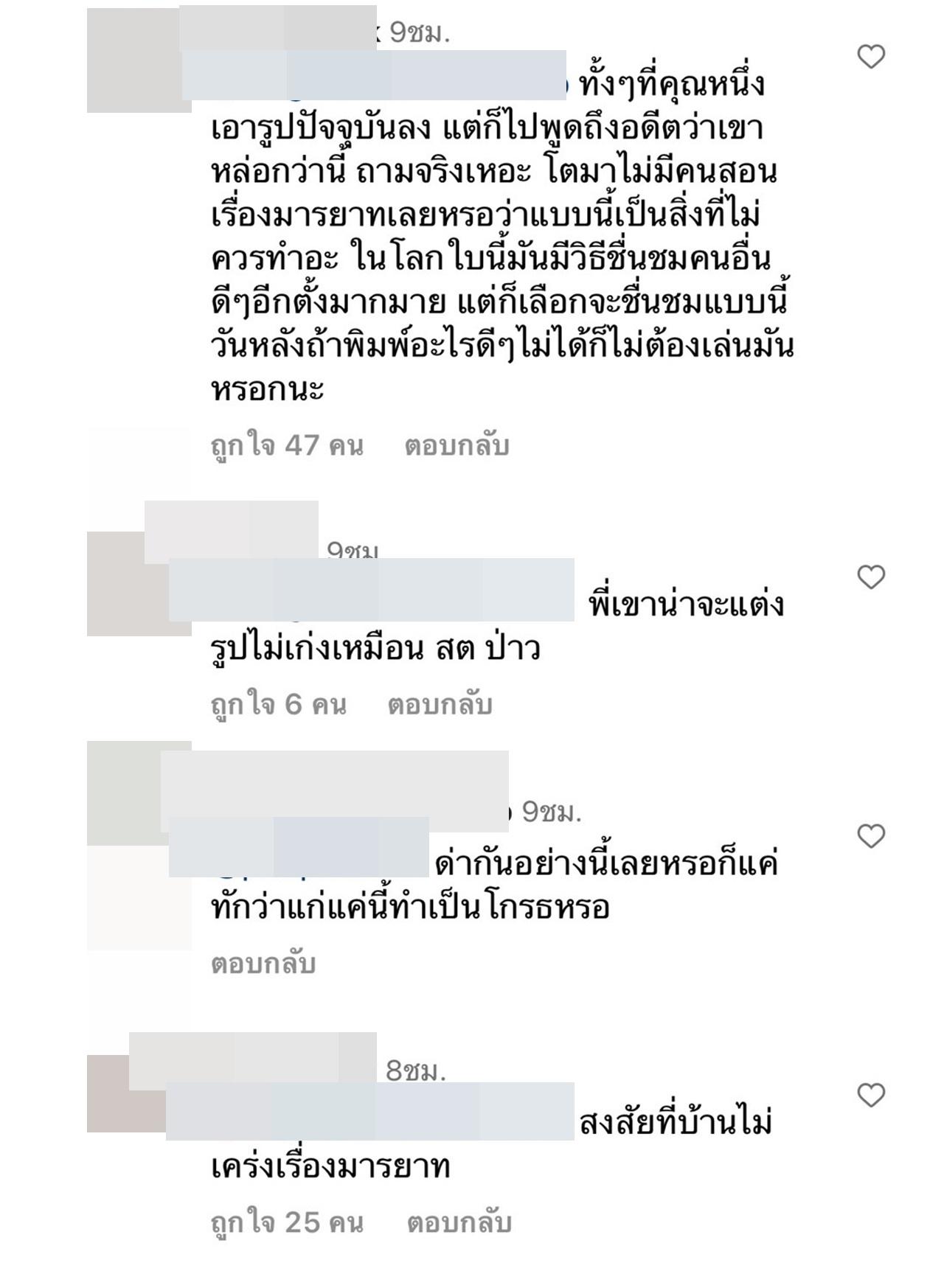 แต่จากคอมเมนต์ดังกล่าว ก็มีชาวเน็ตเข้าไปตำหนิการคอมเมนต์ของเจ้าของคอมเมนต์ดังกล่าวมากมาย อาทิ "ไม่ได้เรียนรู้เรื่องมารยาททางสังคม, มารยาทต่ำดีครับ ต่ำพอๆ กับกำพืดเลยครับ, วิธีการชมคนอื่นมีอีกหลายวิธีมากที่ไม่ใช่เริ่มต้นด้วยคำพูดแย่ๆ เนอะ, อยู่ในสังคมต้องหัดให้เกียรติคนอื่น".