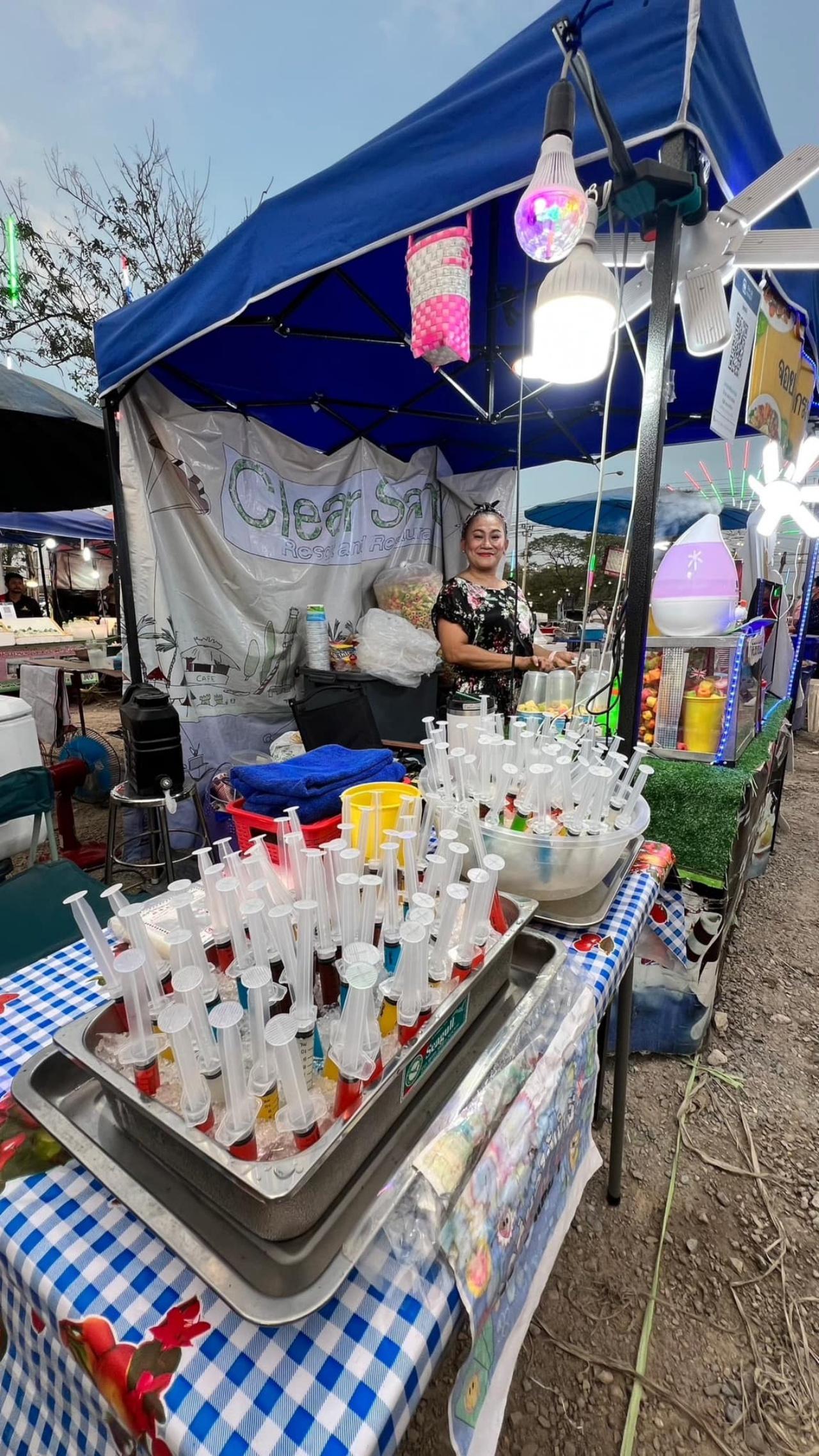 "ใช่ ประมาณนั้น เพราะฉะนั้นเวลากินต้องเข้าปากแล้วเคี้ยว พอเคี้ยวปุ๊บควันมันจะออกปาก ออกจมูก แล้วมันก็จะอร่อย ก็จะบอกว่าเด็กควรจะกินในอายุเท่าไหน ถ้ายังเคี้ยวไม่เป็น อย่าเพิ่งกิน เขาต้องถามเราเด็กกินได้ไหม เราก็บอกว่ากินไม่ได้ ไม่ได้สักแต่จะขายนะ ก็บอกพ่อค้า แม่ค้าทุกคนด้วยนะคะ สักแต่จะขายไม่ได้ เราต้องมีจรรยาบรรณในการเป็นแม่ค้า เราต้องดูลูกค้าด้วยว่าลูกค้าคนนี้กินได้ไหม ถ้าเด็กไปพี่ก็จะเลี่ยงแล้วไปทำวุ้นไซริงค์ แล้วเป็นผลไม้ล้วนๆ ไม่ได้ใส่สีอะไร ทำเองกับมือเด็กกินได้"