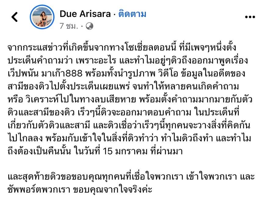 โดยสาว ดิว อริสรา ได้ระบุข้อความว่า "จากกระแสข่าวที่เกิดขึ้นจากทางโซเชียลตอนนี้ ที่มีเพจๆ หนึ่ง ตั้งประเด็นคำถามว่า เพราะอะไร และทำไมอยู่ๆ ดิวถึงออกมาพูดเรื่องเว็บพนัน มาเก๊า 888 พร้อมทั้งนำรูปภาพ วิดีโอ ข้อมูลในอดีตของสามีของดิวไปตั้งประเด็นเผยแพร่ จนทำให้หลายคนเกิดคำถาม หรือวิเคราะห์ไปในทางลบเสียหาย พร้อมตั้งคำถามมากมายกับตัวดิวและสามีของดิว