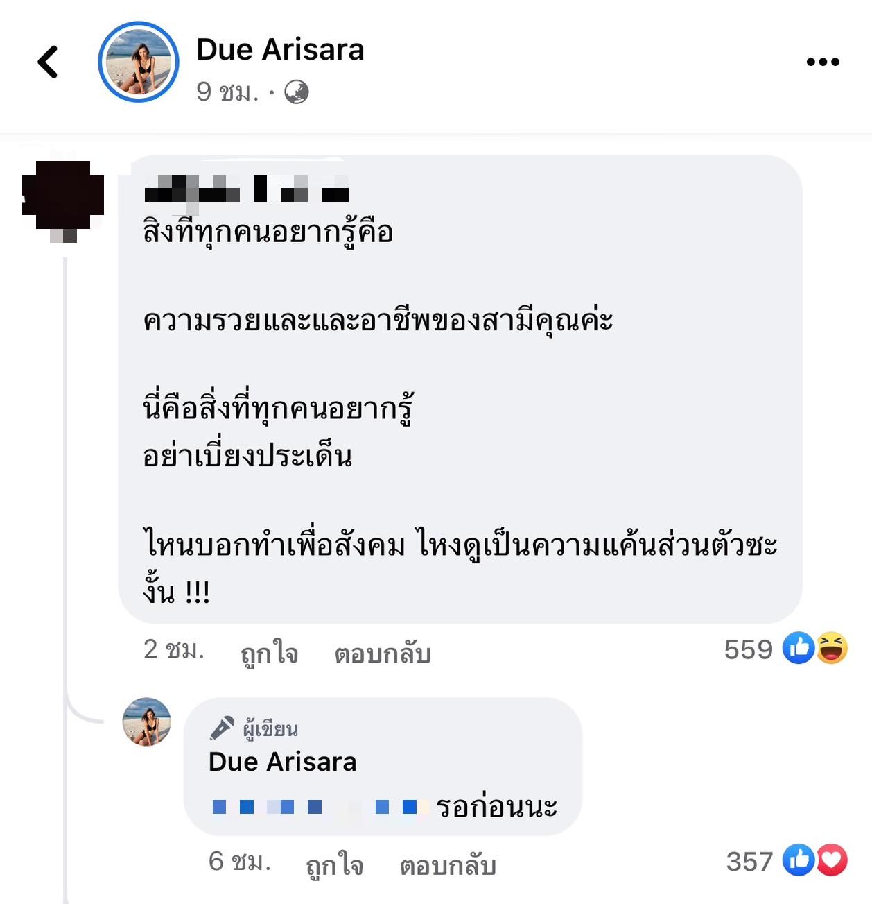 งานนี้ ทำเอาชาวเน็ตที่ตั้งข้อสงสัยเข้ามาคอมเมนต์ใต้โพสต์ดังกล่าวว่า "สิ่งที่ทุกคนอยากรู้คือความรวยและอาชีพของสามีคุณค่ะ นี่คือสิ่งที่ทุกคนอยากรู้ อย่าเบี่ยงประเด็น ไหนบอกทำเพื่อสังคม ไหงดูเป็นความแค้นส่วนตัวซะงั้น !!!" ด้านสาว ดิว อริสรา ก็มาตอบกลับใต้โพสต์ดังกล่าวสั้นๆ ว่า "รอก่อนนะ".