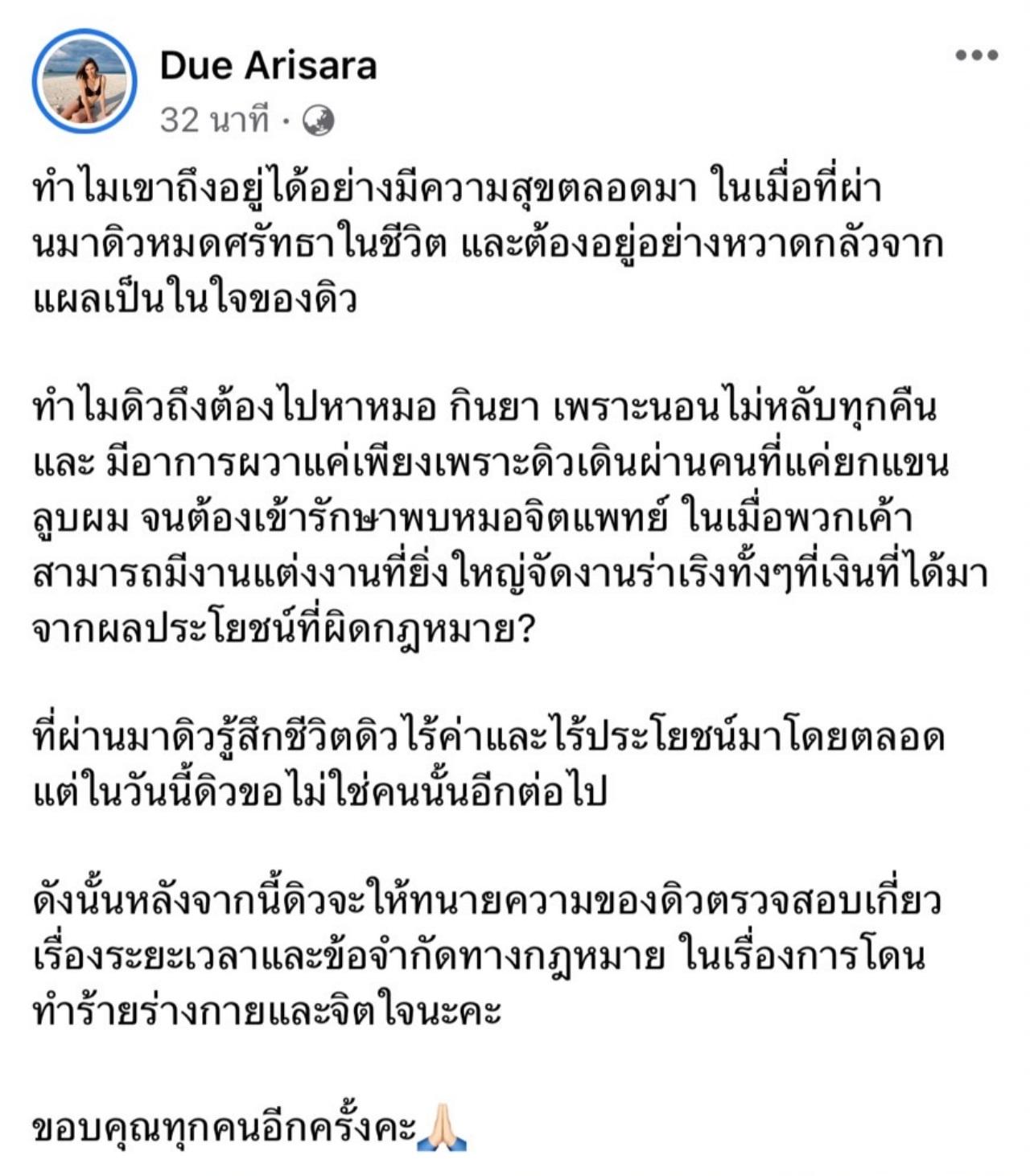 ที่ผ่านมาดิวรู้สึกชีวิตดิวไร้ค่าและไร้ประโยชน์มาโดยตลอด แต่ในวันนี้ดิวขอไม่ใช่คนนั้นอีกต่อไป ดังนั้นหลังจากนี้ดิวจะให้ทนายความของดิวตรวจสอบเกี่ยวเรื่องระยะเวลาและข้อจำกัดทางกฎหมาย ในเรื่องการโดนทำร้ายร่างกายและจิตใจนะคะ ขอบคุณทุกคนอีกครั้งคะ"