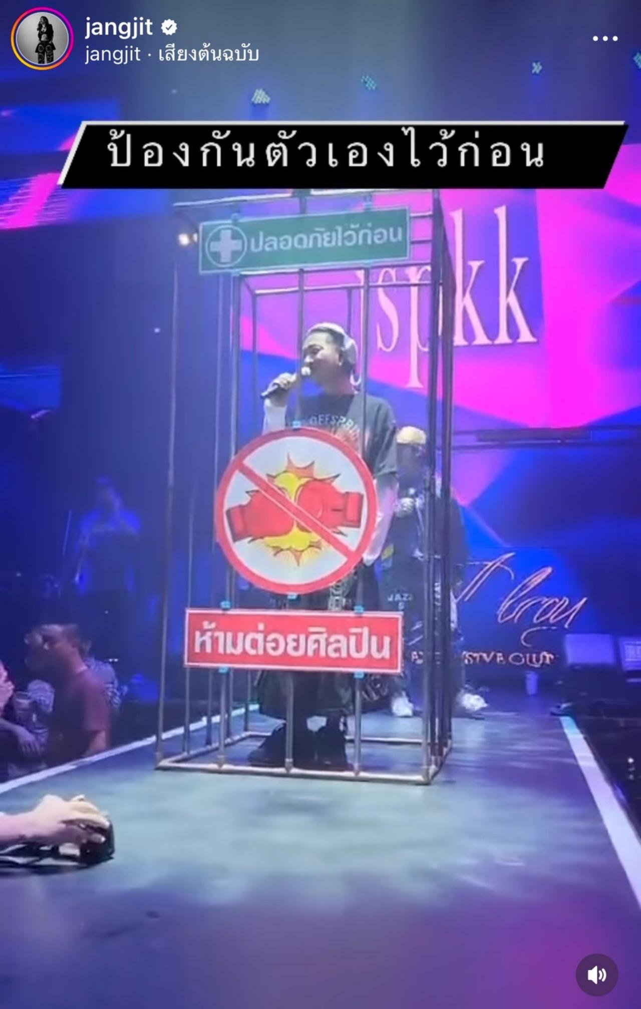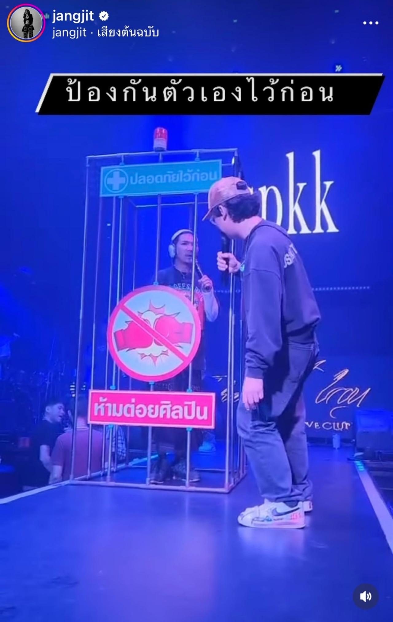 เพราะมีเหตุการณ์ที่ไม่คาดฝันแบบนี้เกิดขึ้น งานนี้ แจง แจงจิตร เมียสุดที่รักของ แจ๊ส ชวนชื่น ก็ได้เผยคลิปวิธีการป้องกันตัวของสามีที่จะไม่ให้ถูกทำร้ายร่างกายในขณะที่ขึ้นเวทีร้องเพลงให้ทุกคนได้อึ้งไปตามๆ กัน พร้อมกับเขียนแคปชั่นว่า "อีแจ๊สสสสสสสส #แจ๊สสปุ๊กนิคปาปิยองกุ๊กกุ๊ก พกกรงมาด้วยหรอ พกกรงมาด้วยหรอเนี่ย"