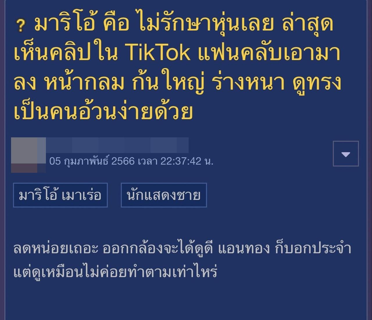 "มาริโอ้ คือ ไม่รักษาหุ่นเลย ล่าสุดเห็นในคลิป TikTok แฟนคลับเอามาลง หน้ากลม ก้นใหญ่ ร่างหนา ดูทรงเป็นคนอ้วนง่าย ลดหน่อยเถอะ ออกกล้องจะได้ดูดี แอนทอง ก็บอกประจำ แต่ดูเหมือนไม่ค่อยทำตามเท่าไหร่"