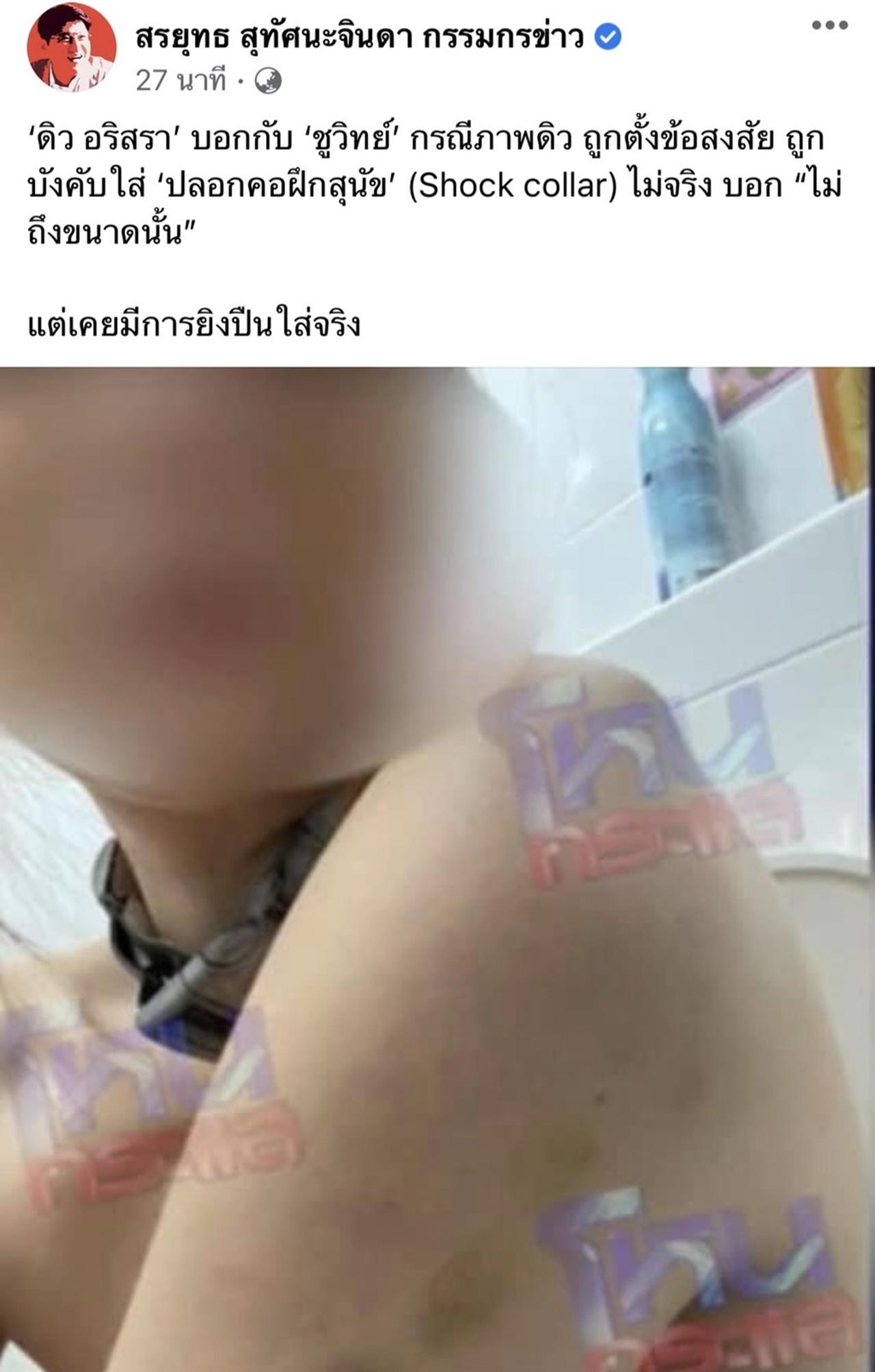 ล่าสุด ในเพจของ สรยุทธ สุทัศนะจินดา กรรมกรข่าว ได้โพสต์ข้อความว่า " ‘ดิว อริสรา’ บอกกับ ‘ชูวิทย์’ กรณีภาพดิว ถูกตั้งข้อสงสัย ถูกบังคับใส่ ‘ปลอกคอฝึกสุนัข’ (Shock collar) ไม่จริง บอก “ไม่ถึงขนาดนั้น”