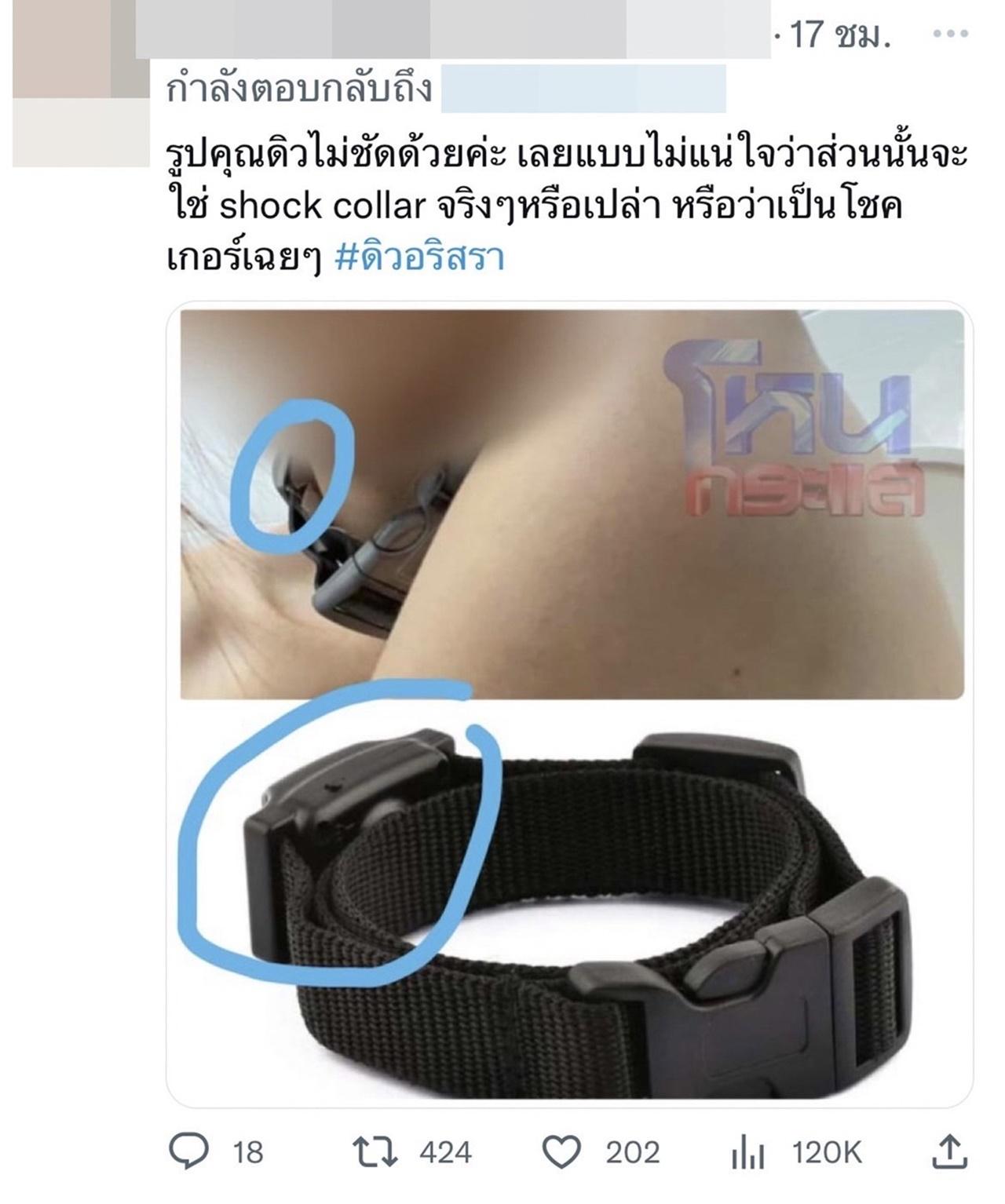 แต่มีอยู่ภาพหนึ่งที่ชาวเน็ตหลายคนเห็นแล้วต่างสงสัยว่าสิ่งที่ ดิว อริสรา ใส่อยู่ที่คอนั้นไม่น่าจะใช่เครื่องประดับ และน่าจะเป็นอุปกรณ์ที่เอาไว้ใช้ฝึกสุนัขมากกว่า ซึ่งประเด็นนี้ก็มีการทวีตพูดคุยกันในทวิตเตอร์อย่างมากมาย
