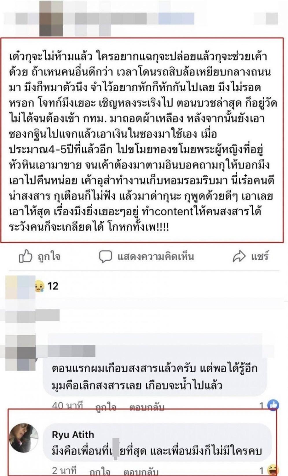 ซึ่ง อาทิตย์ ริว ก็ได้ไปคอมเมนต์กลับใต้โพสต์ดังกล่าวอีกด้วยว่า “มึงคือเพื่อนที่เXยที่สุดและเพื่อนมึงก็ไม่มีใครคบ”
