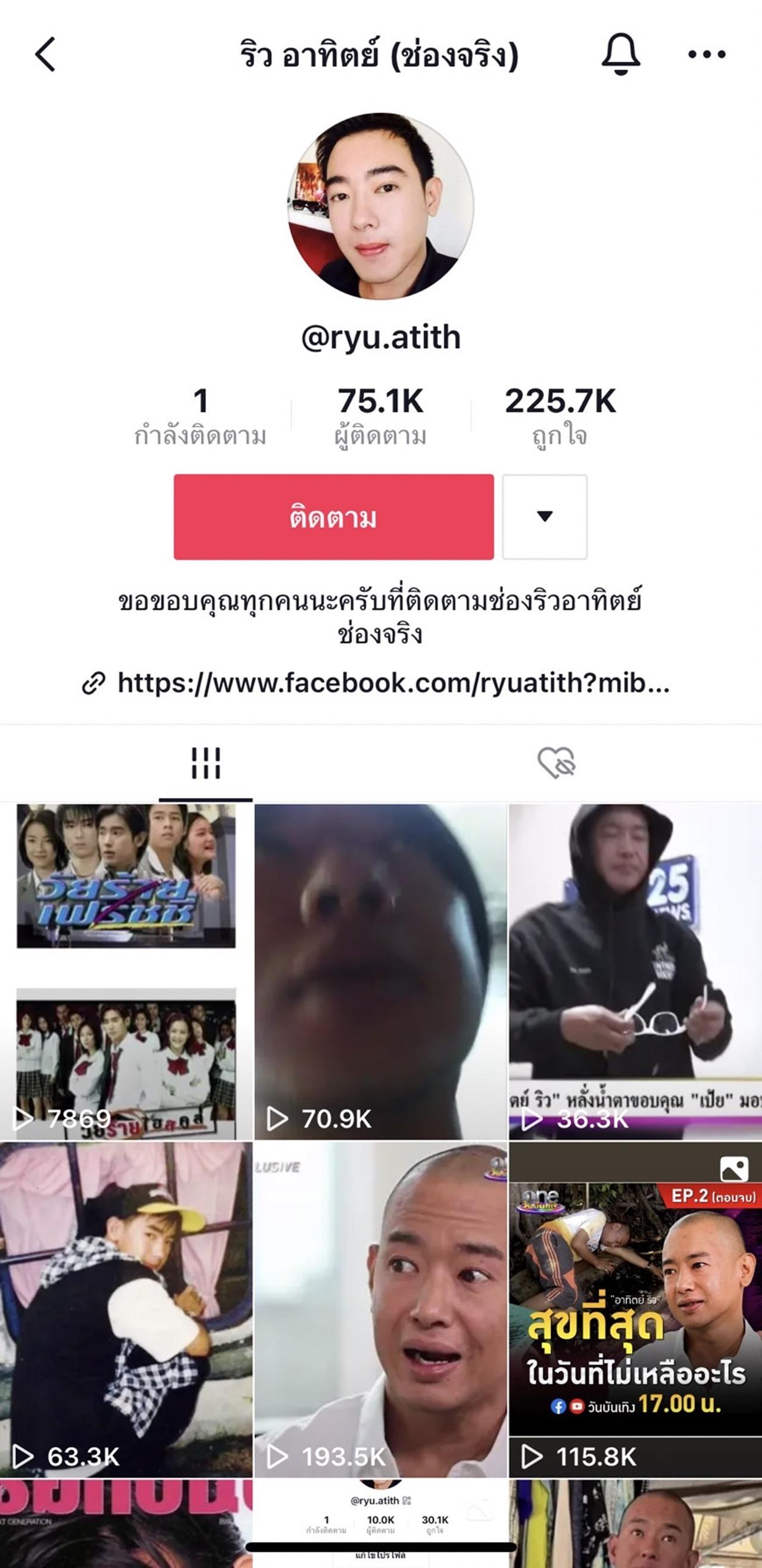 และล่าสุด อาทิตย์ ริว ก็ได้ถือโอกาสดีเปิดพื้นที่ส่วนตัวบนโลกโซเชียลให้แฟนคลับ แฟนละคร ได้เข้ามาพูดคุย ติดตามเรื่องราวชีวิตผ่านทางช่อง TikTok ที่มีชื่อว่า @ryu.atith ริว อาทิตย์ (ช่องจริง) โดยช่องดังกล่าว ริว ได้เอาคลิป ผลงานต่างๆ ในอดีตมาโพสต์ลง และอัปเดตชีวิตในแต่ละวันของตนเองให้แฟนๆ ได้เห็นกัน