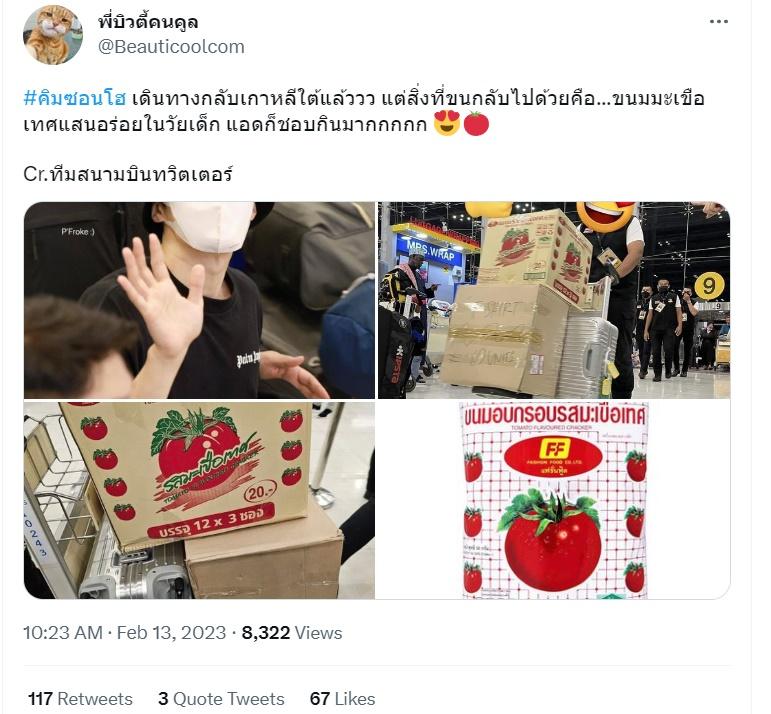 และเมื่อช่วงดึกวันที่ 12 ก.พ. 2566 ที่ผ่านมา คิมซอนโฮเดินทางกลับไปเกาหลีใต้เรียบร้อยแล้ว ท่ามกลางซอนโฮฮาดาไทยที่พร้อมใจไปส่งพระเอกหนุ่มแน่นท่าอากาศยานนานาชาติสุวรรณภูมิ แต่ดูเหมือนพิซอนน่าจะติดใจขนมไทยเข้าซะแล้ว เพราะมีคนสังเกตว่าเจ้าตัวขนขนมอบกรอบรสมะเขือเทศกล่องใหญ่กลับเกาหลีใต้ไปด้วย โดยมีทีมงานขนกล่องขนมพร้อมกระเป๋าเดินทาง เพื่อโหลดเข้าใต้เครื่องบิน