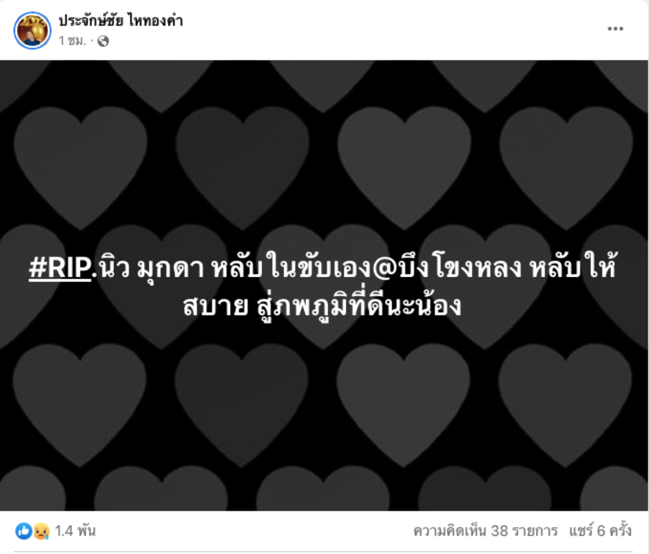 โดยนายห้าง ประจักษ์ชัย ไหทองคำ ได้โพสต์ข้อความแสดงความเสียใจต่อการจากไปของพระเอกหมอลำแห่งยุคว่า “#RIP.นิว มุกดา หลับในขับเอง @บึงโขงหลง หลับให้สบาย สู่ภพภูมิที่ดีนะน้อง”