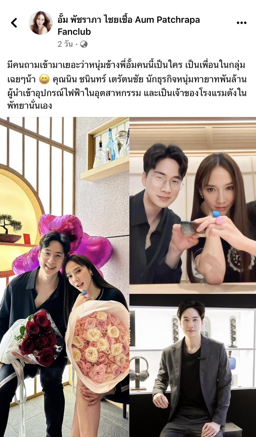 โดยทางด้านของเเฟนเพจเฟซบุ๊ก อั้ม พัชราภา ไชยเชื้อ Aum Patchrapa Fanclub ได้ออกมาเฉลยสถานะของทั้งคู่ไว้แล้วว่า "มีคนถามเข้ามาเยอะว่าหนุ่มข้างพี่อั้มคนนี้เป็นใคร เป็นเพื่อนในกลุ่มเฉยๆ น้า คุณนิน ชนินทร์ เตรัตนชัย นักธุรกิจหนุ่มทายาทพันล้าน ผู้นำเข้าอุปกรณ์ไฟฟ้าในอุตสาหกรรม และเป็นเจ้าของโรงแรมดังในพัทยานั่นเอง"
