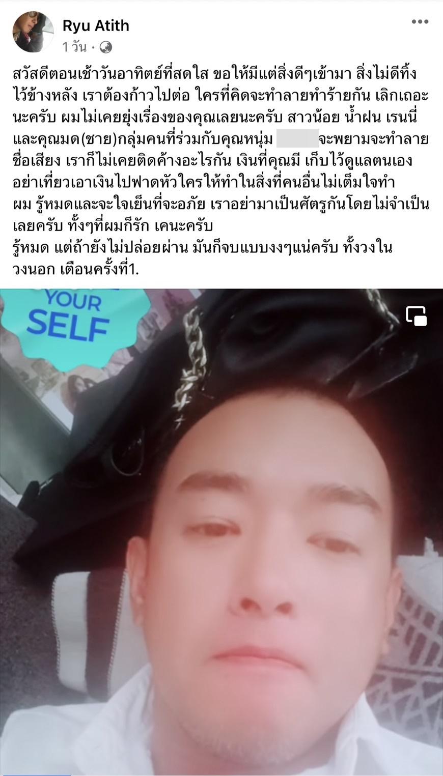 แต่ล่าสุด อาทิตย์ ริว ก็ออกมาโพสต์เดือดอีกครั้งผ่านทางเฟซบุ๊กส่วนตัว Ryu Atith โดยบอกว่า “สวัสดีตอนเช้าวันอาทิตย์ที่สดใส ขอให้มีแต่สิ่งดีๆ เข้ามา สิ่งไม่ดีทิ้งไว้ข้างหลัง เราต้องก้าวไปต่อ ใครที่คิดจะทำลายทำร้ายกัน เลิกเถอะนะครับ ผมไม่เคยยุ่งเรื่องของคุณเลยนะครับ สาวน้อย น้ำฝน เรนนี่ และคุณมด (ชาย) กลุ่มคนที่ร่วมกับคุณหนุ่ม จะพยายามจะทำลายชื่อเสียง