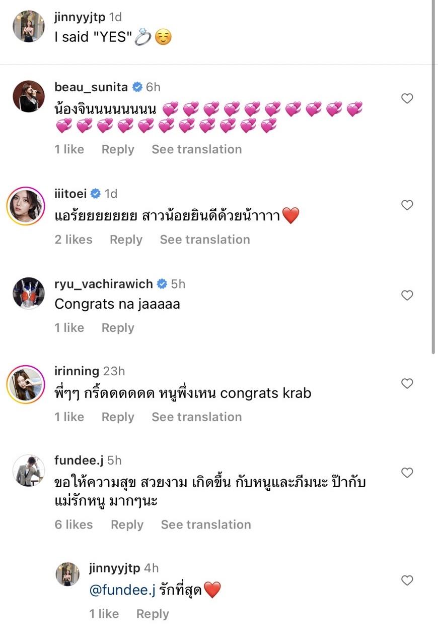 โดยในอินสตาแกรม @jinnyyjtp ของจินนี่ ได้โพสต์ภาพบรรยากาศตอนถูกขอแต่งงาน เห็นแหวนที่สวมอยู่บนนิ้วนางซ้ายของจินนี่อย่างชัดเจน พร้อมทั้งเขียนแคปชั่นสั้นๆ ว่า “I said "YES"” และใส่อีโมจิรูปแหวนและหน้ายิ้ม