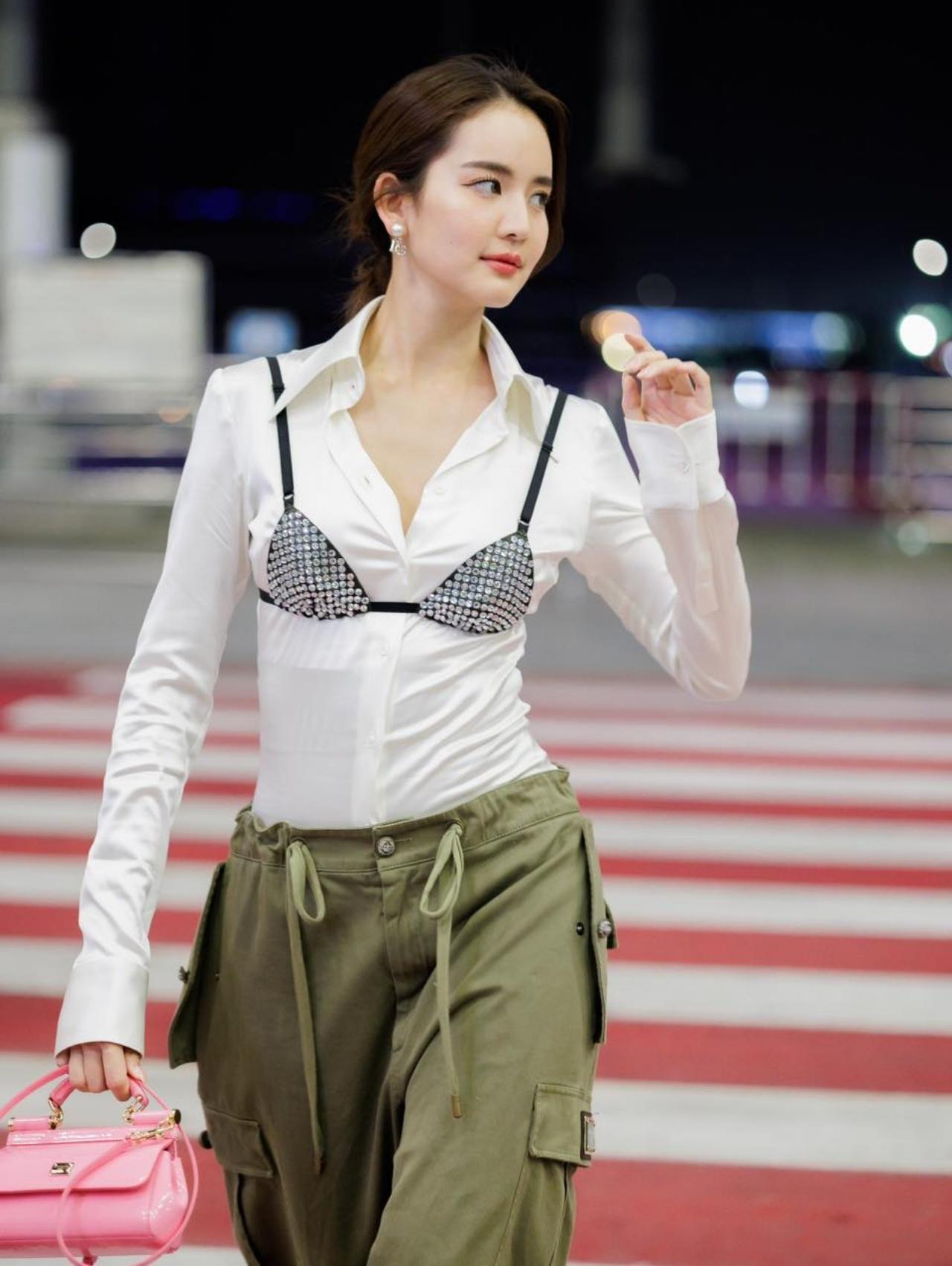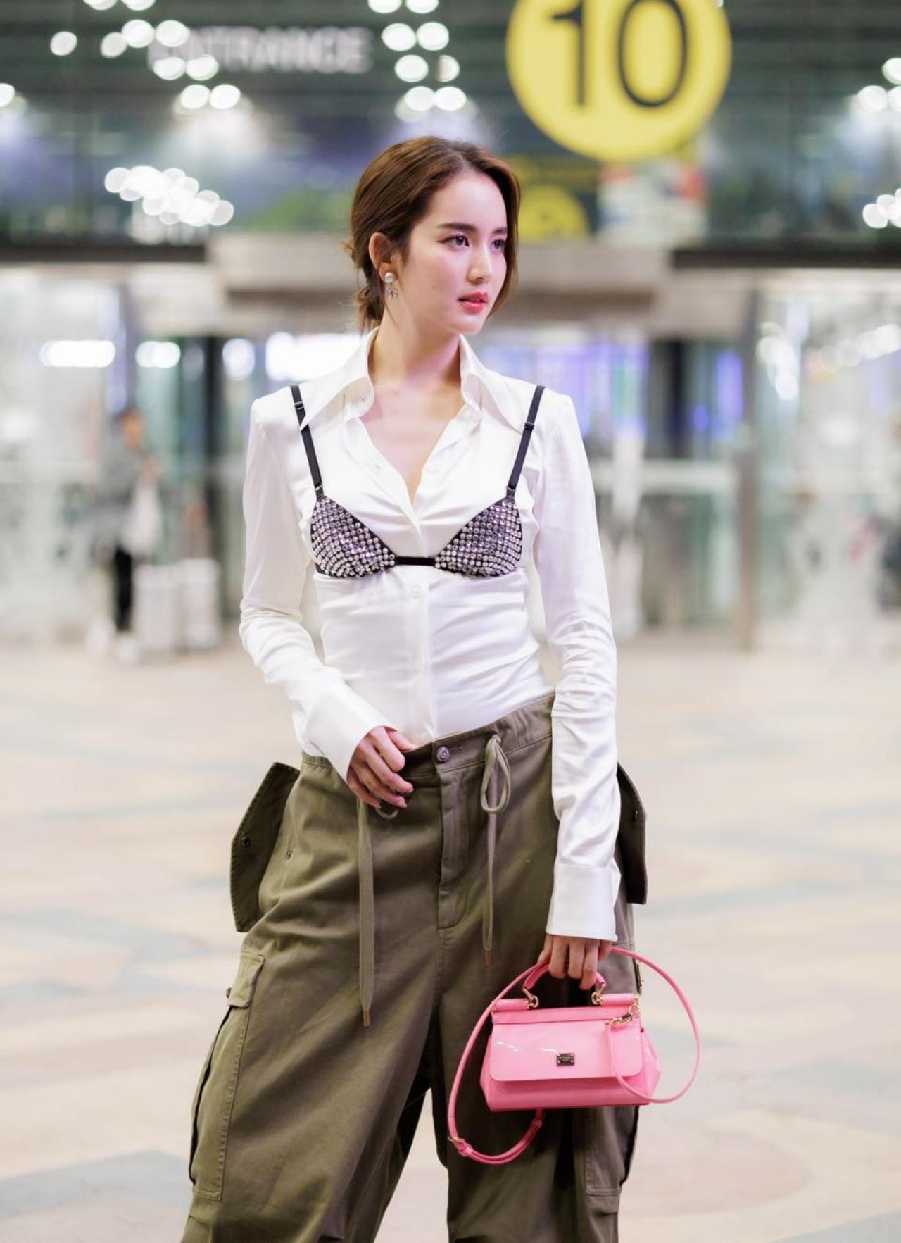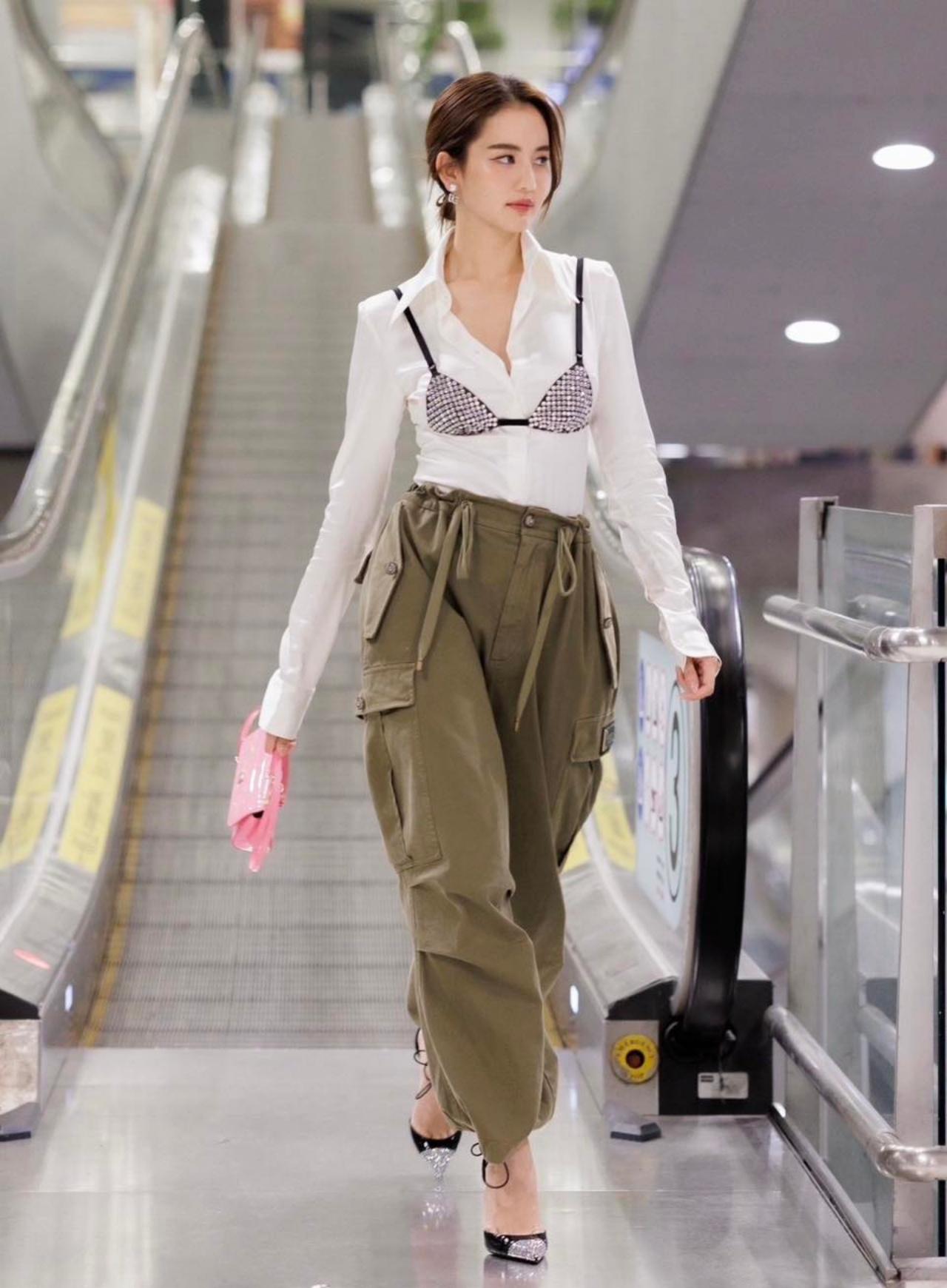 ใส่บราประดับคริสตัลสวมทับเสื้อเชิ้ตซาตินสีขาว มิกซ์แอนแมตช์ด้วยกางเกงคาร์โก้สีเขียวกากี จากคอลเลกชัน Spring/Summer 2023 และสวมรองเท้าส้นสูงสีดำประดับเพชร ตัดด้วยกระเป๋า Sicily หนังเคลือบเงาสีชมพู จากแบรนด์ Dolce&Gabbana
