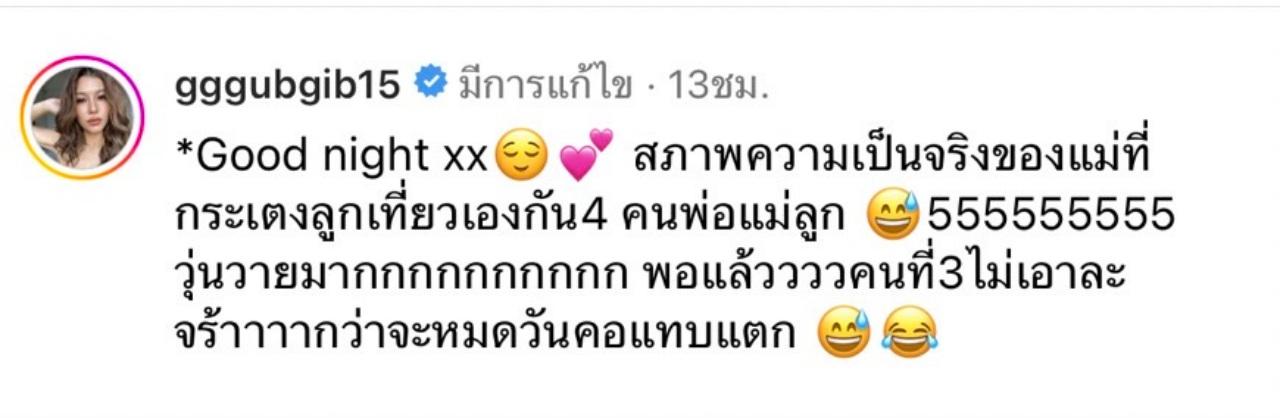 ซึ่งนอกจากจะมีภาพสวยๆ มาฝากแฟนๆ แล้ว ยังถือว่าเป็นทริปแรกที่ กุ๊บกิ๊บกับบี้ ได้พาลูกสาว 2 คน น้องเป่าเปา-น้องเป่าเปย์ ไปเที่ยวกันแบบ 4 คนจริงๆ โดยไม่มีใครมาช่วยเลี้ยง งานนี้ทำเอา แม่กุ๊บกิ๊บ ถึงกับเอ่ยปากออกมาเลยว่า ขอหยุดที่ลูก 2 คนพอ จะไม่มีคนที่ 3 แล้ว เพราะเหนื่อยมาก