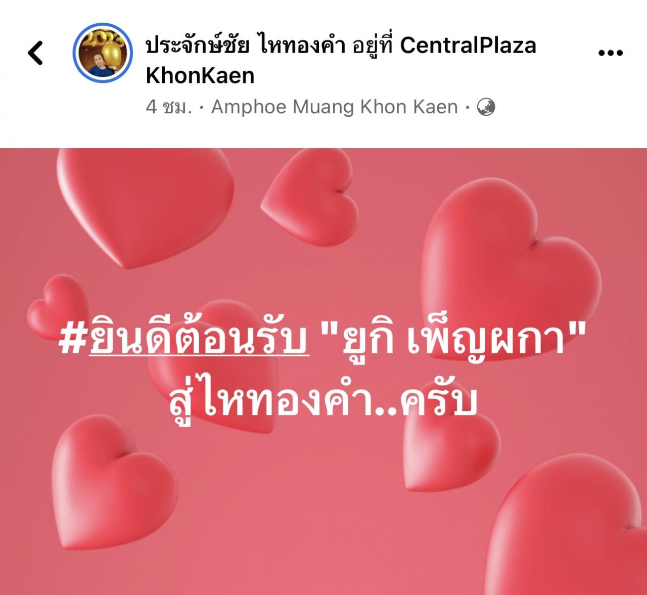 แต่งานนี้ต้องบอกเลยว่าเพชรอยู่ที่ไหนก็คือเพชร เมื่อ ประจักษ์ชัย ออกมาประกาศต้อนรับ ยูกิ เพ็ญผกา นางเอกหมอลำลูกครึ่งญี่ปุ่นสู่ค่ายไหทองคำ โดยได้โพสต์ระบุข้อความดังกล่าวสั้นๆ ว่า “ยินดีต้อนรับ ยูกิ เพ็ญผกา สู่ไหทองคำ..ครับ”