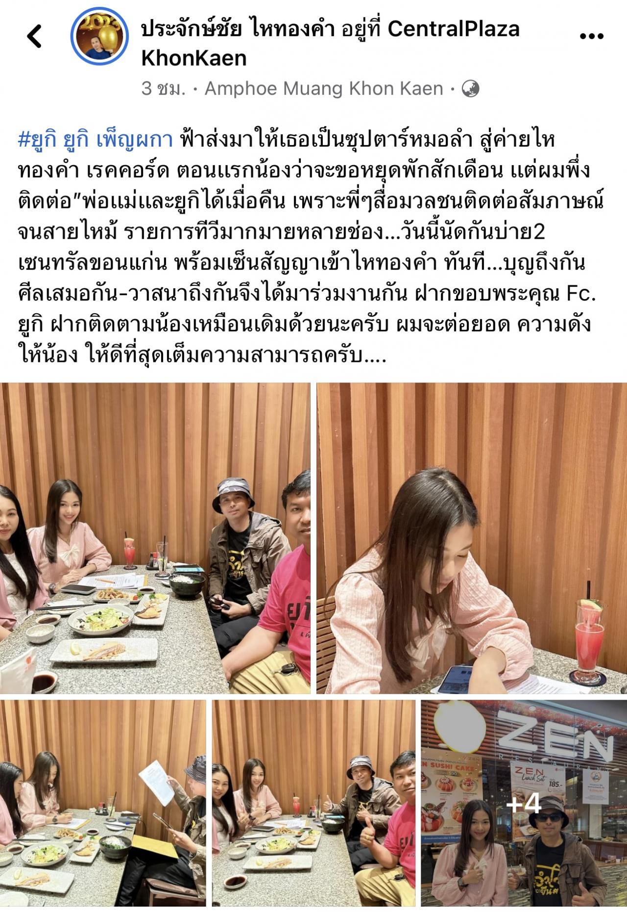 วันนี้นัดกันบ่าย2 เซ็นทรัลขอนแก่น พร้อมเซ็นสัญญาเข้าไหทองคำ ทันที…บุญถึงกัน ศีลเสมอกัน-วาสนาถึงกันจึงได้มาร่วมงานกัน ฝากขอบพระคุณ Fc. ยูกิ ฝากติดตามน้องเหมือนเดิมด้วยนะครับ ผมจะต่อยอด ความดังให้น้อง ให้ดีที่สุดเต็มความสามารถครับ….”