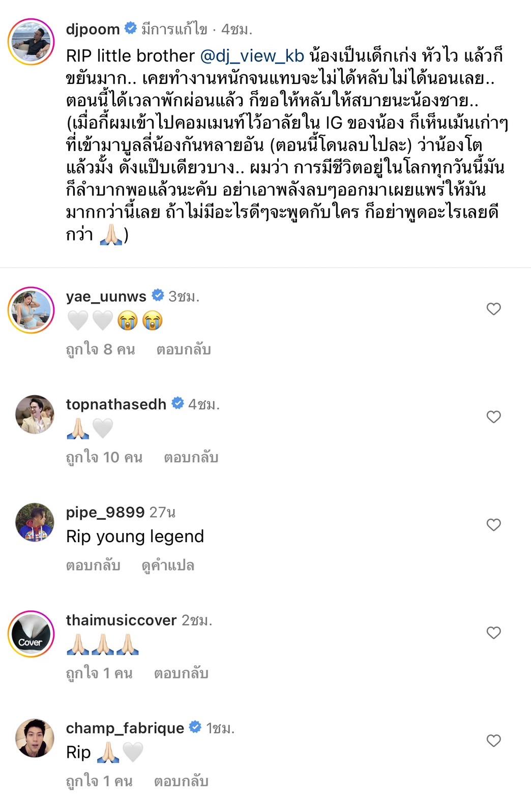 "RIP little brother @dj_view_kb น้องเป็นเด็กเก่ง หัวไว แล้วก็ขยันมาก.. เคยทำงานหนักจนแทบจะไม่ได้หลับไม่ได้นอนเลย.. ตอนนี้ได้เวลาพักผ่อนแล้ว ก็ขอให้หลับให้สบายนะน้องชาย..