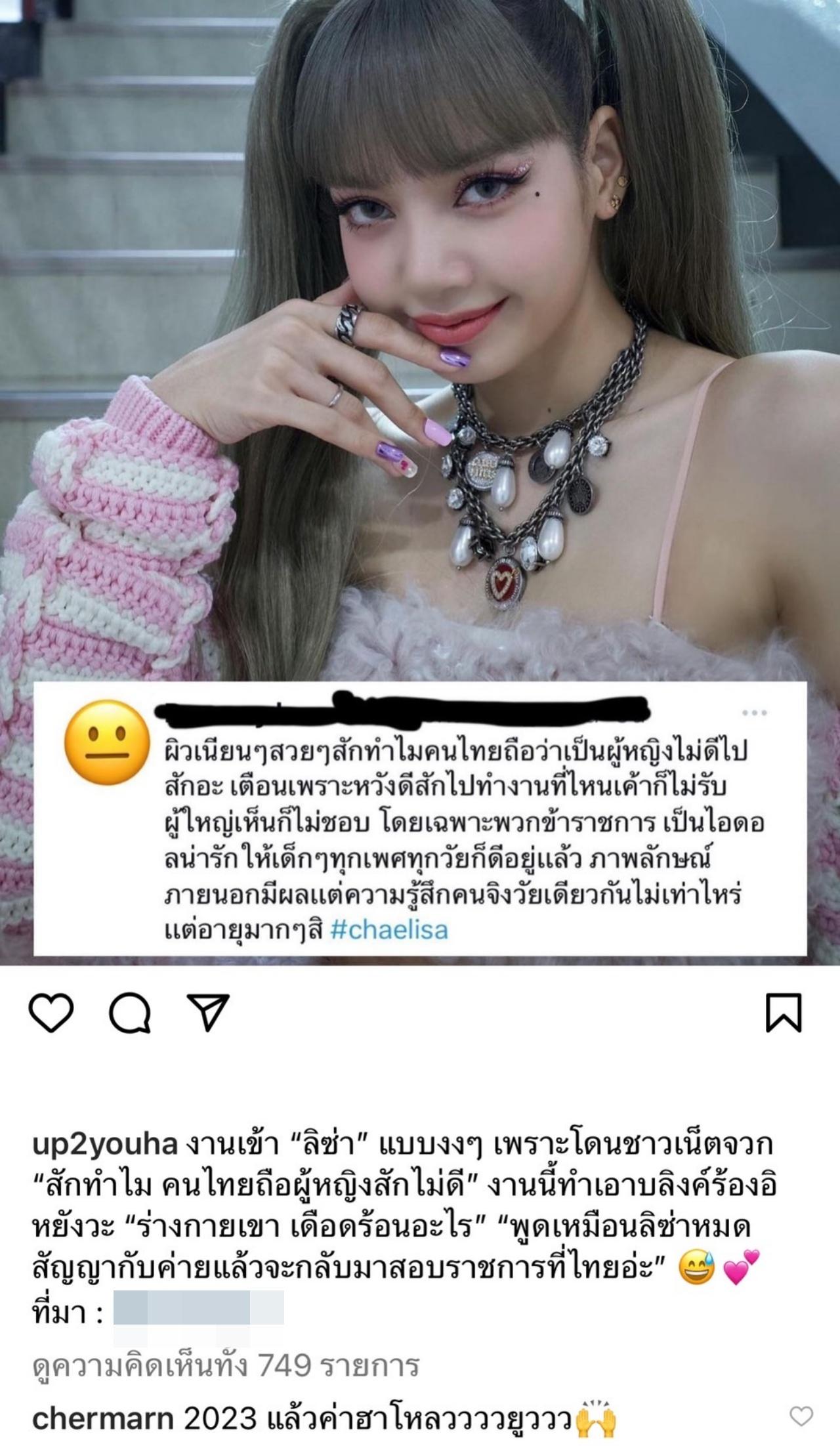 พร้อมโพสต์แคปชั่นว่า "งานเข้า ลิซ่า แบบงงๆ เพราะโดนชาวเน็ตจวก สักทำไม คนไทยถือผู้หญิงสักไม่ดี" งานนี้ทำเอาชาวเน็ตต้องเข้ามาคอมเมนต์แสดงความคิดเห็นมากมาย เช่น "ร่างกายเขา เดือดร้อนอะไร, พูดเหมือนลิซ่าหมดสัญญากับค่ายแล้วจะกลับมาสอบราชการที่ไทยอ่ะ"