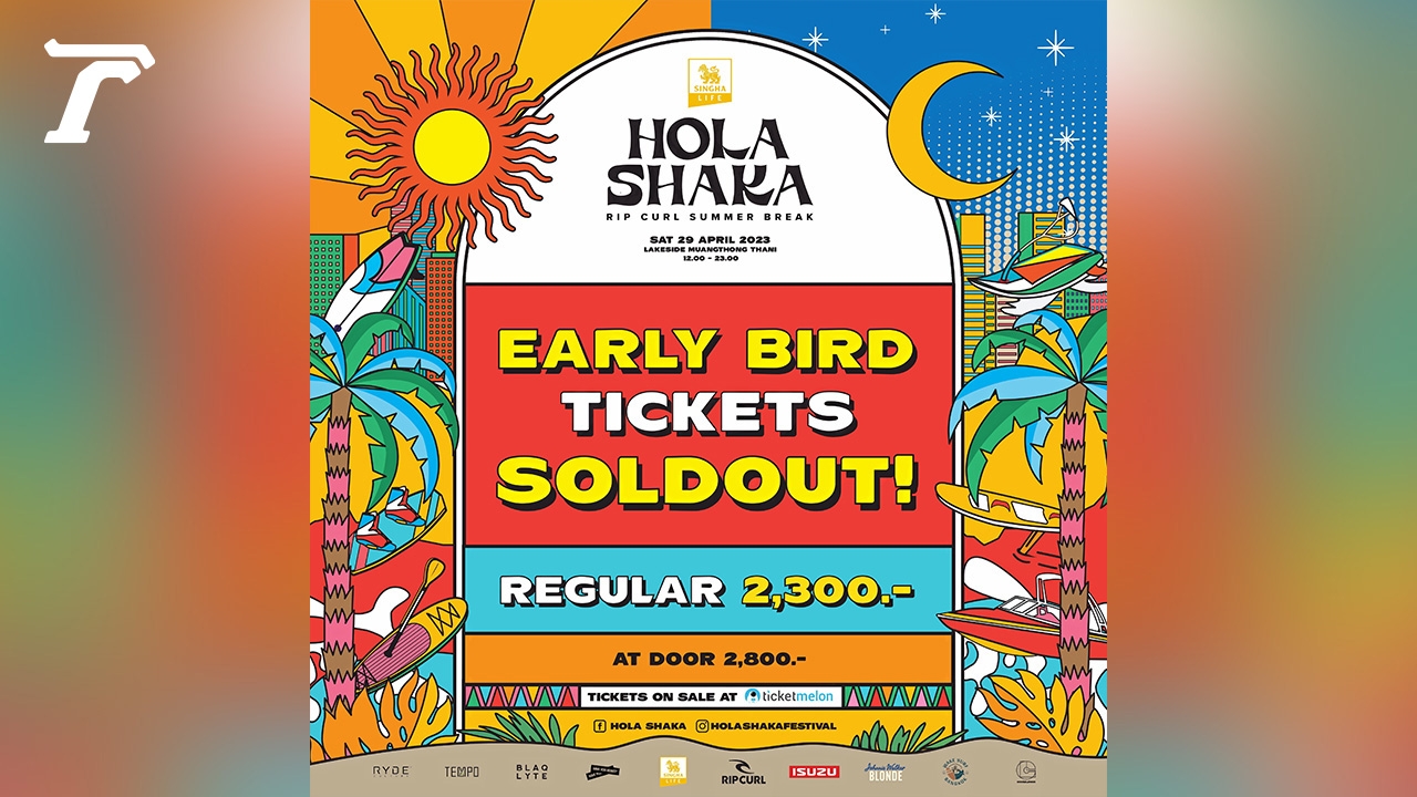 สำหรับชาว โฮลาชาก้า ที่พลาดซื้อบัตร Early Bird ไม่ทัน ไม่ต้องเสียใจ!! ยังสามารถกดซื้อบัตร Regular มูลค่าเพียง 2,300 บาท ผ่านทาง https://www.ticketmelon. com/ripcurl/holashaka ได้ถึงวันที่ 28 เมษายนนี้ ก่อนจะปรับเป็นราคา At Door มูลค่า 2,800 บาท.