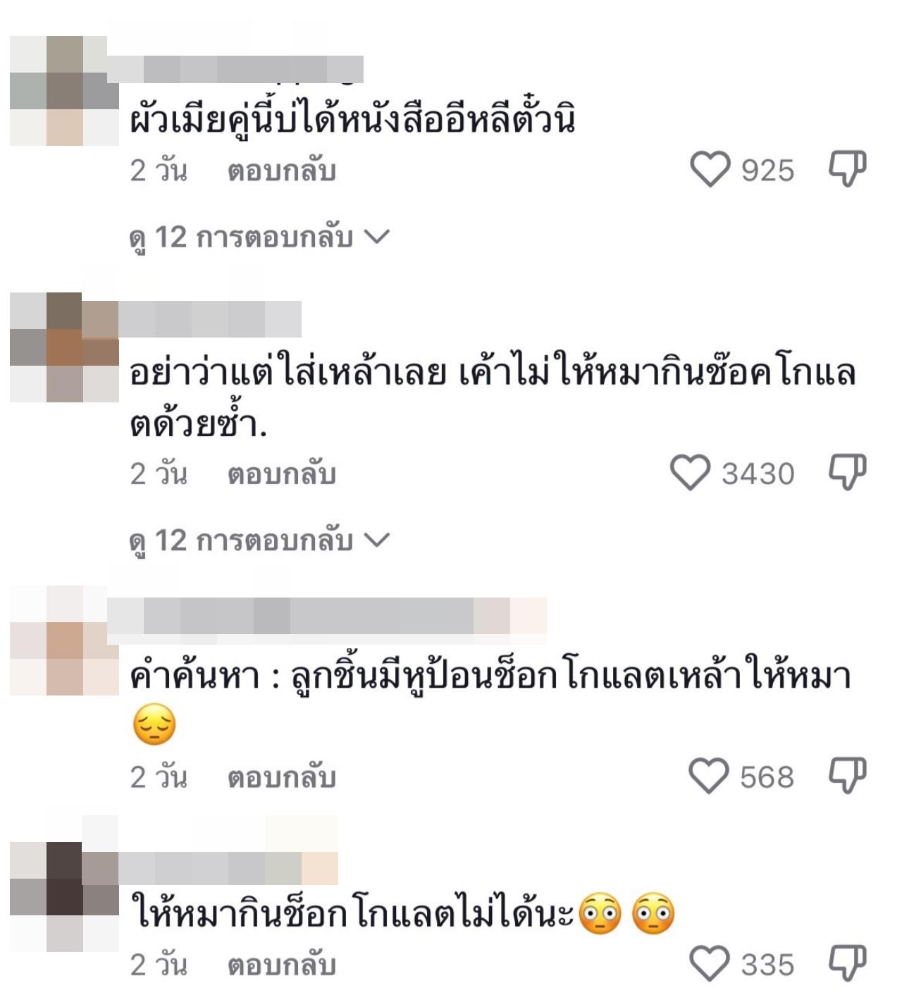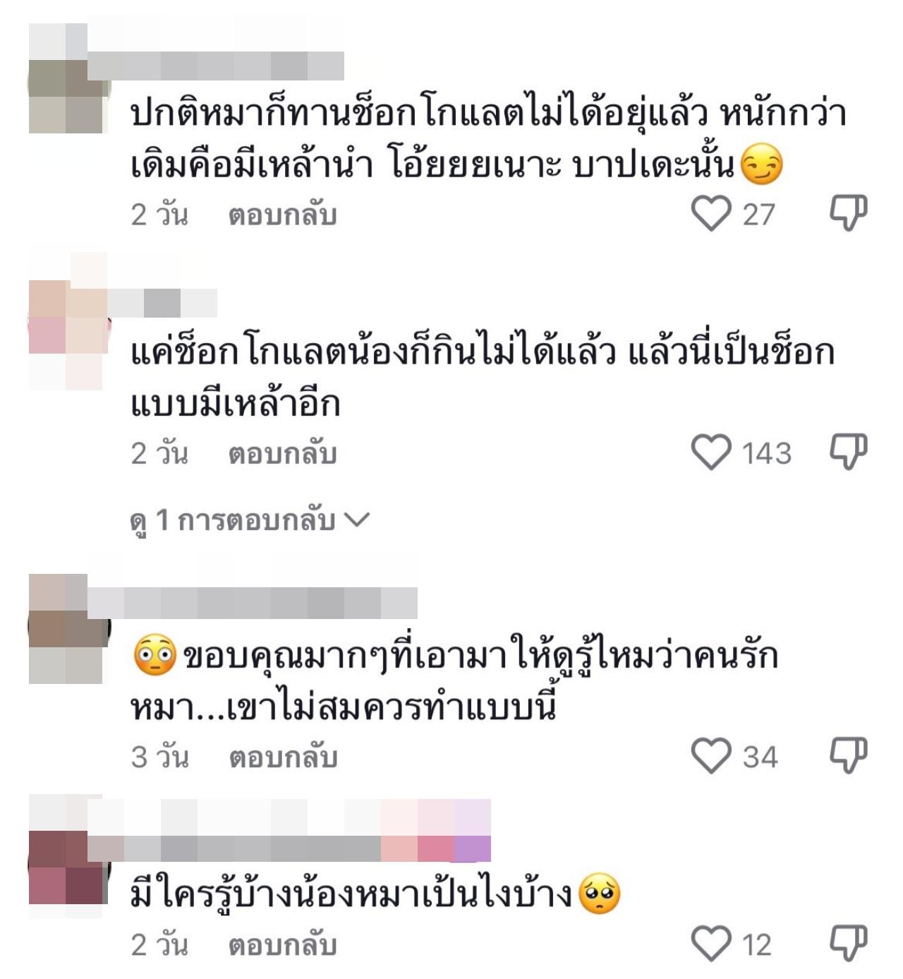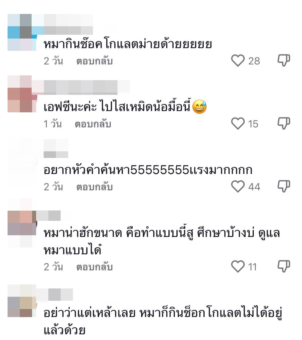 หลังจากที่ชาวเน็ตได้ดูคลิปดังกล่าว ก็ได้เข้ามาคอมเมนต์ถึงการกระทำดังกล่าวอย่างมากมาย เช่น "อย่าว่าแต่ใส่เหล้าเลย เค้าไม่ให้หมากินช๊อคโกแลตด้วยซ้ำ, หมากินช๊อกโกแลตไม่ได้ระวังชักหรือหัวใจเต้นผิดปกติ, น้องกินช็อกโกแลตไม่ได้ โอ๊ยยสู, บ่ได้เรียนหนังสืออีหลีตั๊วนิ, อยากเลี้ยงแต่ไม่รู้วิธีเลี้ยง"