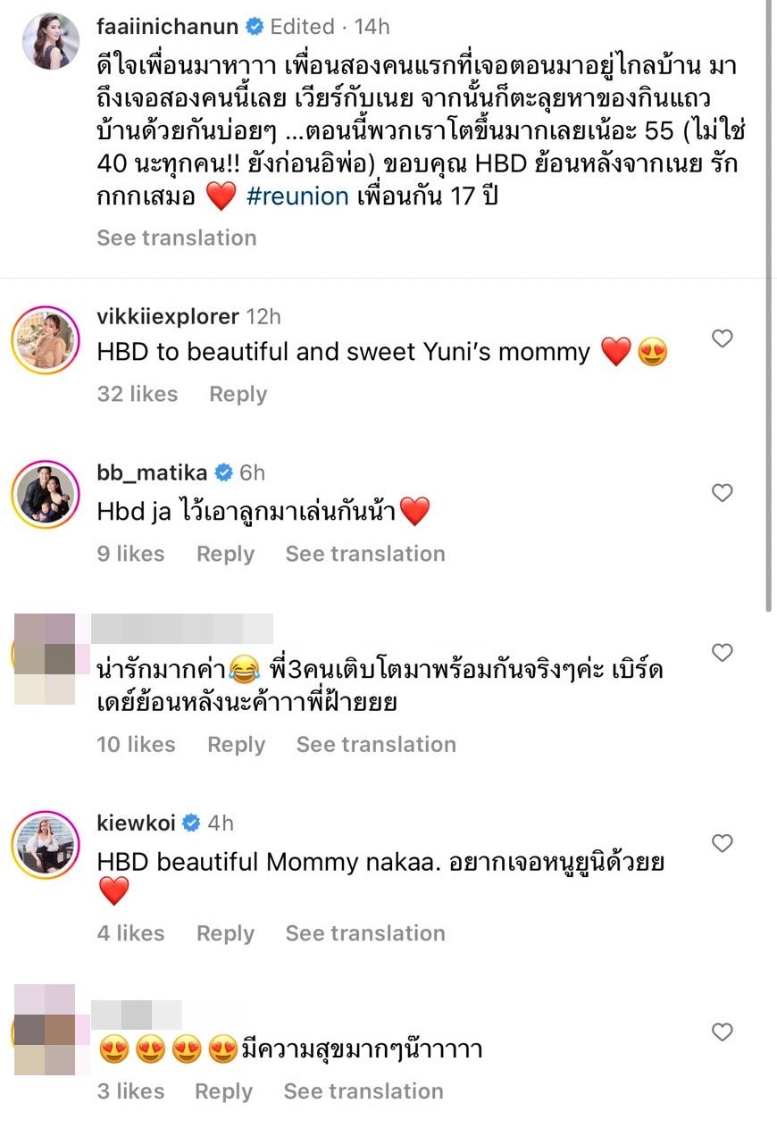 ท่ามกลางคอมเมนต์จากแฟนๆ ที่บอกว่าทั้ง 3 คนเติบโตมาพร้อมกันจริงๆ พร้อมทั้งอวยพรวันเกิด ด้าน วิกกี้ ก็คอมเมนต์อวยพรว่า “HBD to beautiful and sweet Yuni’s mommy” ส่วน บี มาติกา บอกว่า “Hbd ja ไว้เอาลูกมาเล่นกันน้า”.