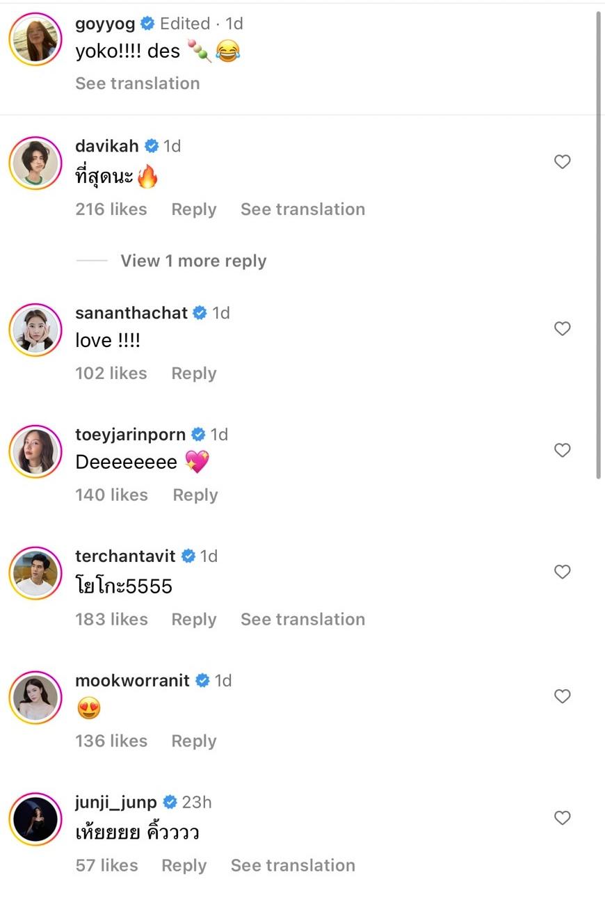 งานนี้หลายคนต่างคอมเมนต์ชมว่าสวยมาก ดูแพงมาก ลุคนี้ดีมาก และส่งอีโมจิหัวใจกับไฟลุกแบบรัวๆ รวมถึงคนในวงการบันเทิงที่เข้ามาคอมเมนต์ อาทิ ใหม่ ดาวิกา, เต้ย จรินทร์พร, ฝน ศนันธฉัตร, มุก วรนิษฐ์, เต๋อ ฉันทวิชช์, จันจิ จันจิรา, นิวเคลียร์ หรรษา ฯลฯ