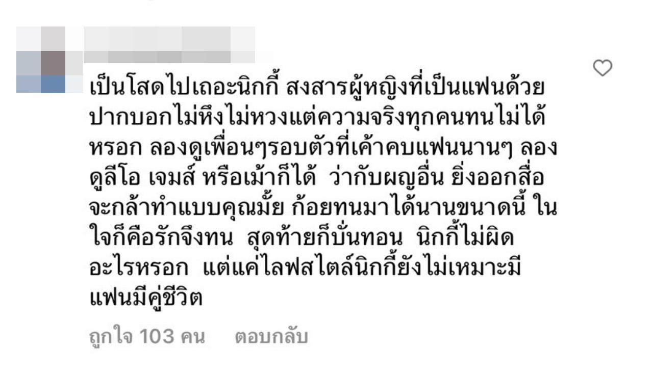 "เป็นโสดไปเถอะนิกกี้ สงสารผู้หญิงที่เป็นแฟนด้วย ปากบอกไม่หึงไม่หวงแต่ความจริงทุกคนทนไม่ได้หรอก ลองดูเพื่อนๆ รอบตัวที่เค้าคบแฟนนานๆ ลองดูลีโอ เจมส์ หรือเม้าก็ได้ ว่ากับผญอื่น ยิ่งออกสื่อจะกล้าทำแบบคุณมั้ย ก้อยทนมาได้นานขนาดนี้ ในใจก็คือรักจึงทน สุดท้ายก็บั่นทอน นิกกี้ไม่ผิดอะไรหรอก แต่แค่ไลฟ์สไตล์นิกกี้ยังไม่เหมาะมีแฟนมีคู่ชีวิต"