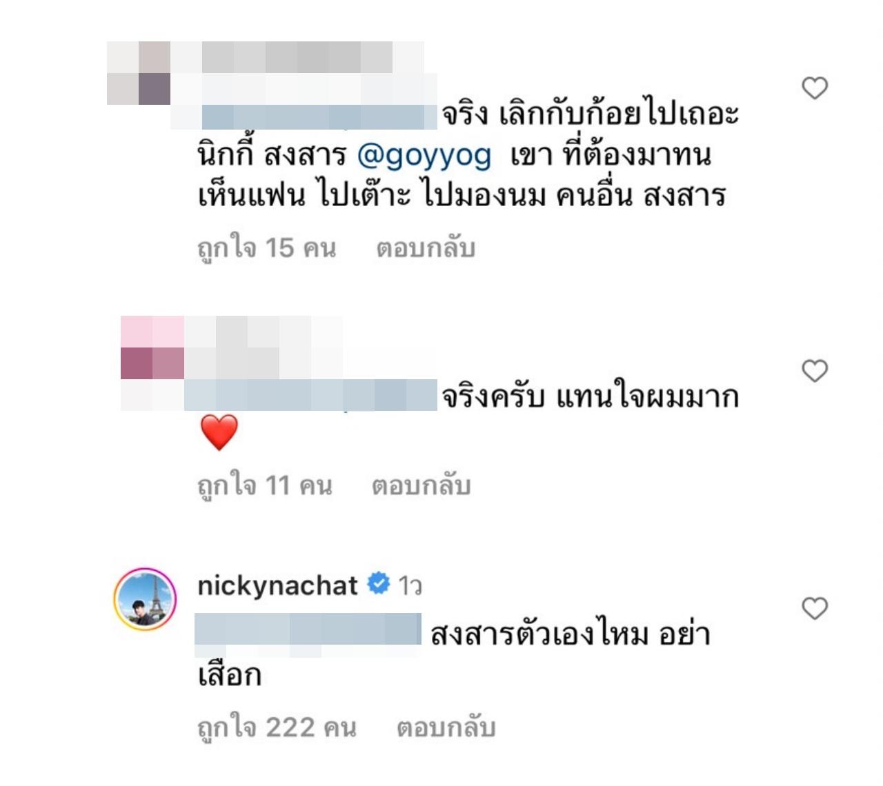 จากนั้นก็ได้มีคนเข้ามาเห็นด้วยกับคอมเมนต์ดังกล่าวเขียนว่า "จริง เลิกก้อยไปเถอะนิกกี้ สงสารเขาที่ต้องมาทนเห็นแฟนไปเต๊าะ ไปมองนมคนอื่น สงสาร" งานนี้ นิกกี้ ตอบกลับทันควัน "สงสารตัวเองไหม อย่าเ_สือก".