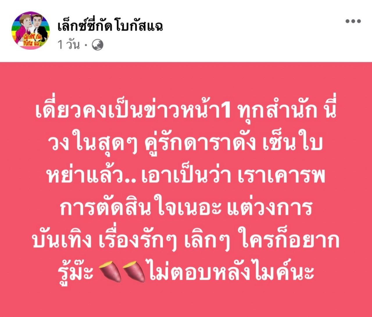 "เดี่ยวคงเป็นข่าวหน้า 1 ทุกสำนัก นี่วงในสุดๆ คู่รักดาราดัง เซ็นใบหย่าแล้ว..เอาเป็นว่า เราเคารพการตัดสินใจเนอะ แต่วงการบันเทิง เรื่องรักๆ เลิกๆ ใครก็อยากรู้ม๊ะ ไม่ตอบหลังไมค์นะ"