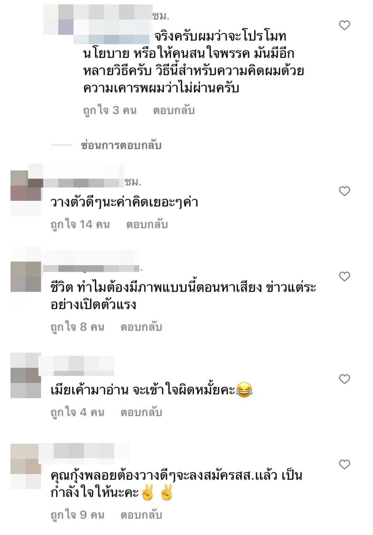 "โลกโซเชียลไว้ใจใครไม่ได้ ต้องวางตัวดีๆ นะคะ, ชีวิต ทำไมต้องมีภาพแบบนี้ตอนหาเสียง ข่าวแต่ละอย่างเปิดตัวแรง, วางตัวดีๆ นะคะ คิดเยอะๆ ค่า, คุณกุ้งพลอยต้องวางตัวดีๆ จะลงสมัคร ส.ส.เเล้ว เป็นกำลังใจให้นะคะ, เมียเขามาอ่าน จะเข้าใจผิดไหมคะ".