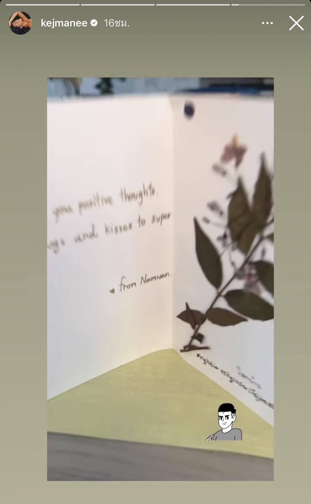 และเมื่อซูมในการ์ดเพื่อนของปิ่นได้เขียนข้อความว่า "Sending you positive thoughts. Lots of hugs and kisses to super mommy. From Namwan"