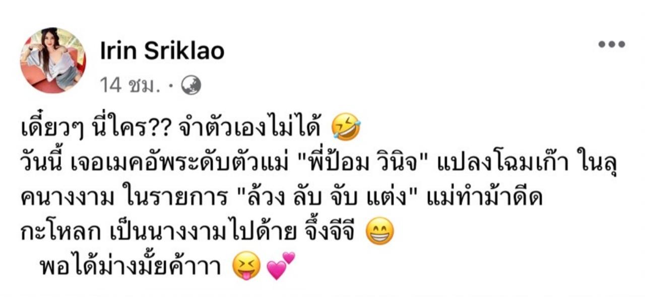 ล่าสุดทำเอาแฟนๆ ที่ติดตามต่างร้องว้าวในความสวยของ เปิ้ล ไอริณ อย่างมาก เมื่อเจ้าตัวได้โพสต์ภาพตัวเองในลุคนางงาม ที่ได้เมคอัพอาร์ตติสระดับแถวหน้าของวงการ ป้อม วินิจ มาช่วยสะบัดแปรงแต่งหน้าเนรมิตความปังระดับพรีเมียม ด้วยการเปลี่ยนลุคให้กลายเป็นนางงามตั้งแต่ศีรษะจรดปลายเท้า