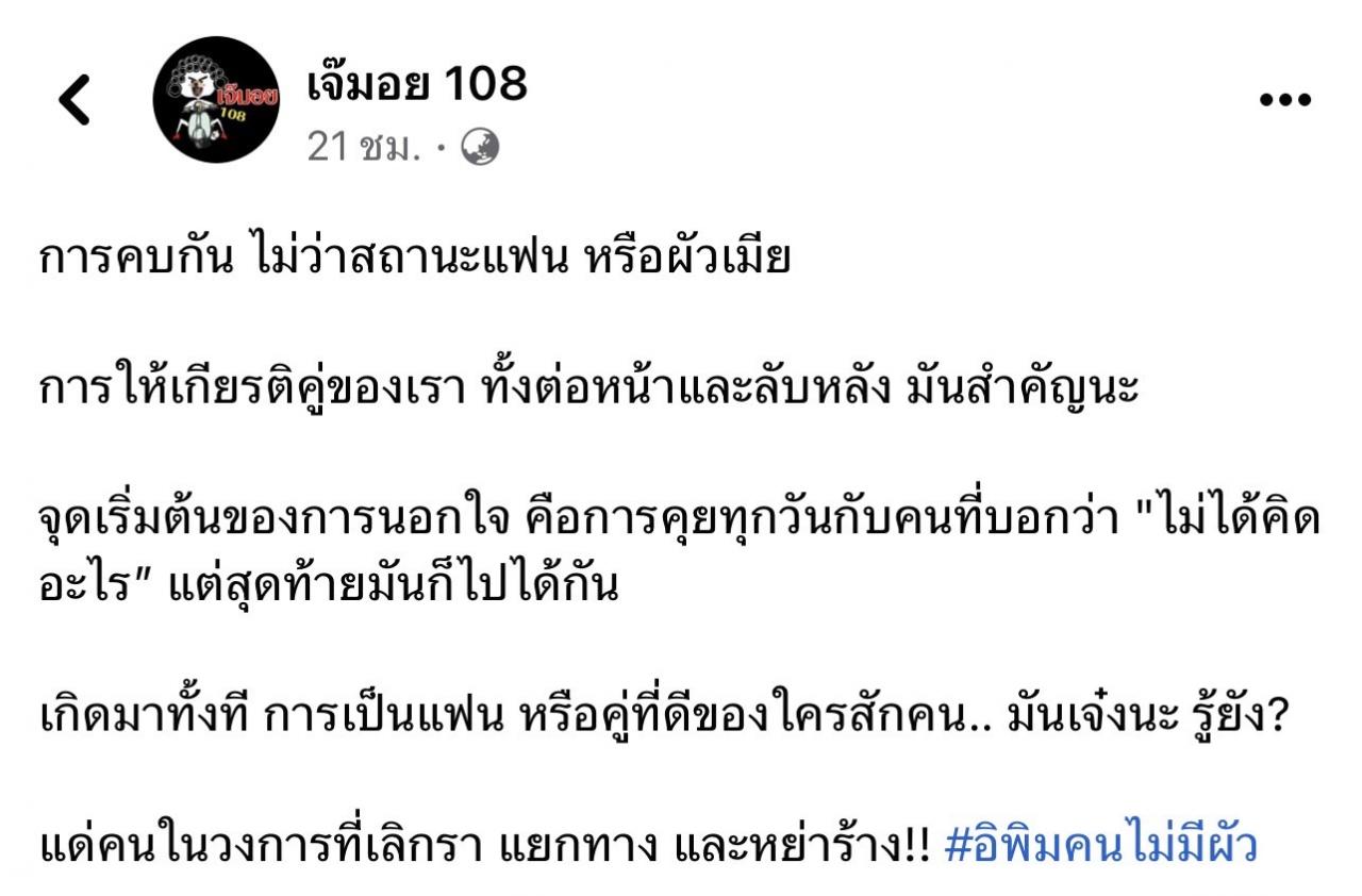 ตกเย็นมาเป็นช่วงเวลาหลังเลิกงาน มีเรื่องราวมาให้ขาเม้าท์ได้อ่านกันอีกแล้ว หลังจากที่เพจดัง เจ๊มอย108 โพสต์ข้อความลอยๆ เหมือนว่ามีอะไรซ่อนเร้นให้ต่อมเผือกชาวบ้านกระตุกยิกๆ อีกแล้ว เกี่ยวกับเรื่องผัวๆ เมียๆ แต่ไม่รู้ว่าจะเป็นคู่รักดาราคู่ไหนกันแน่